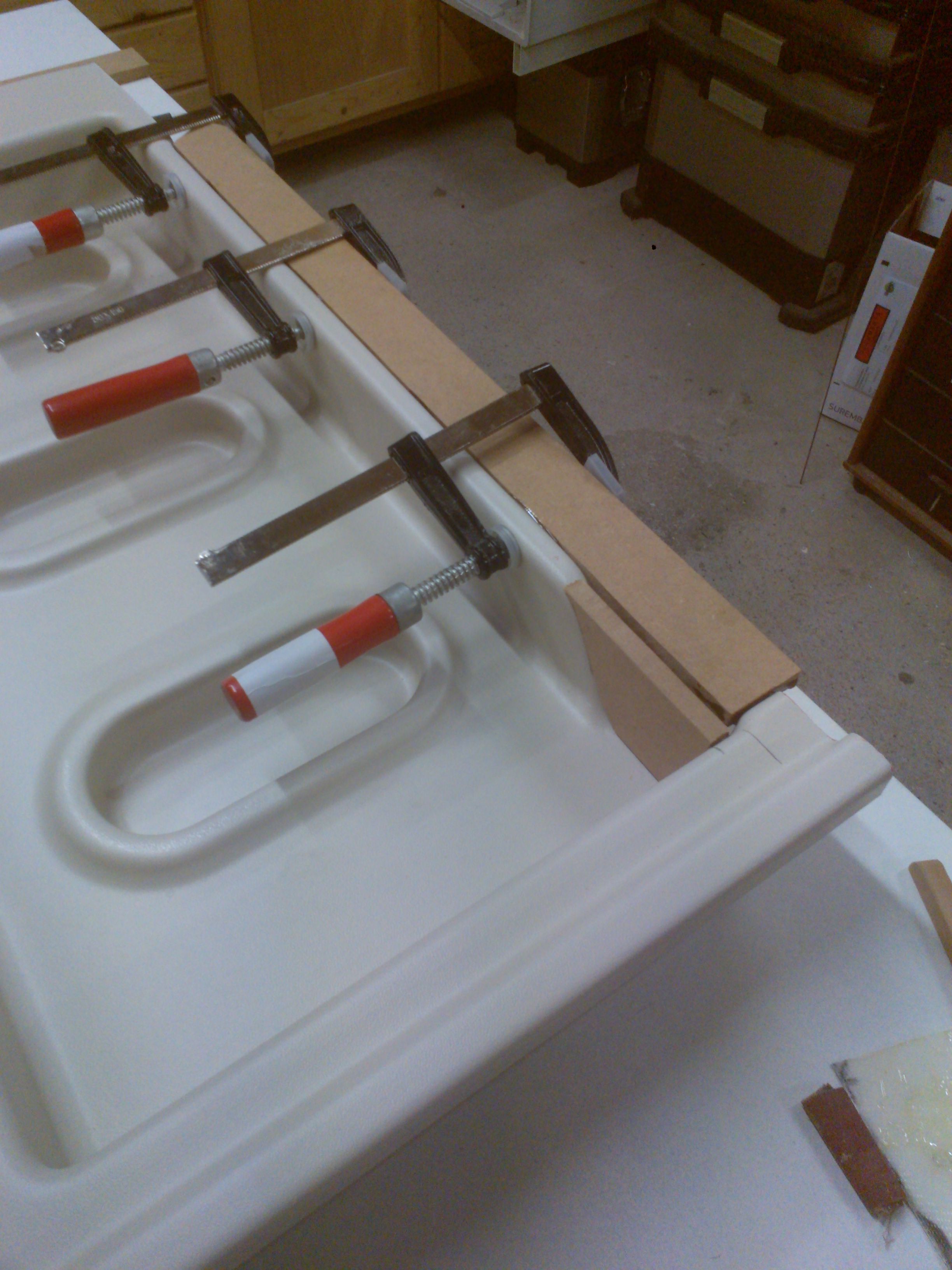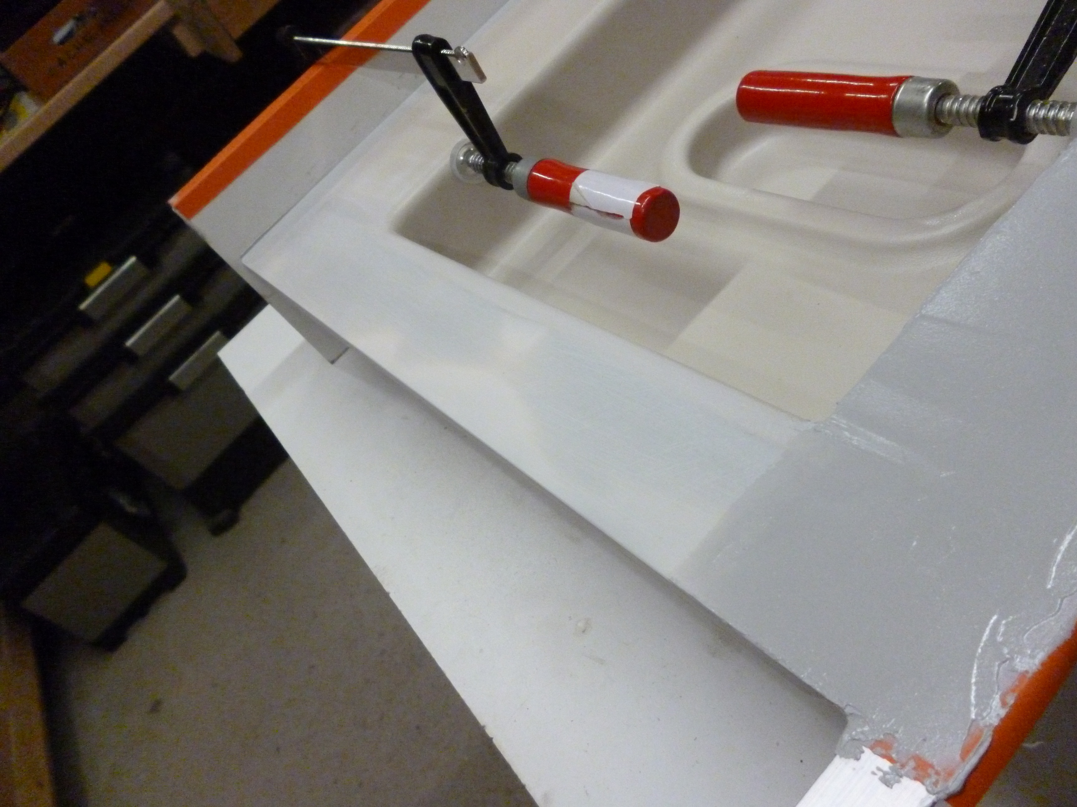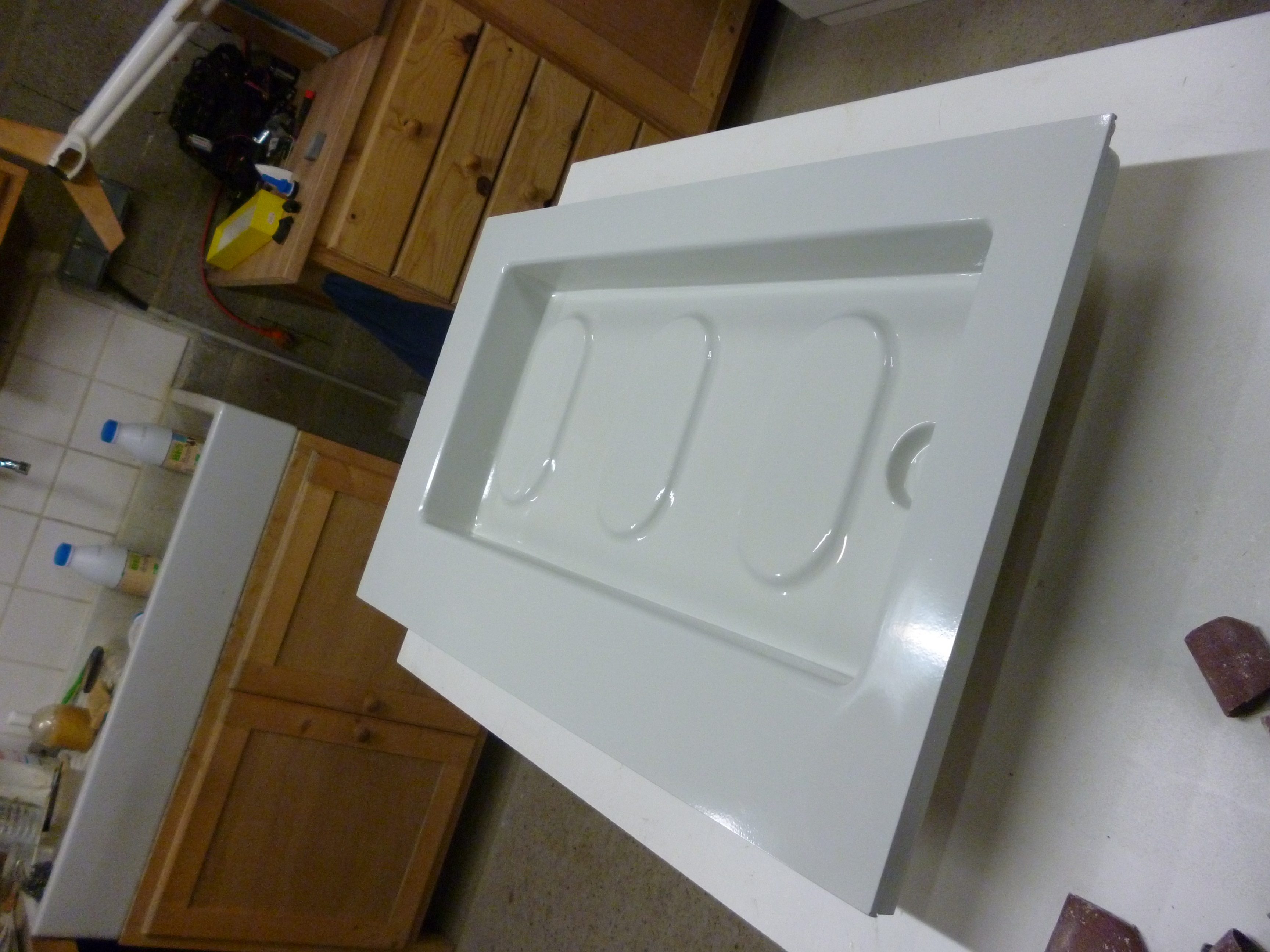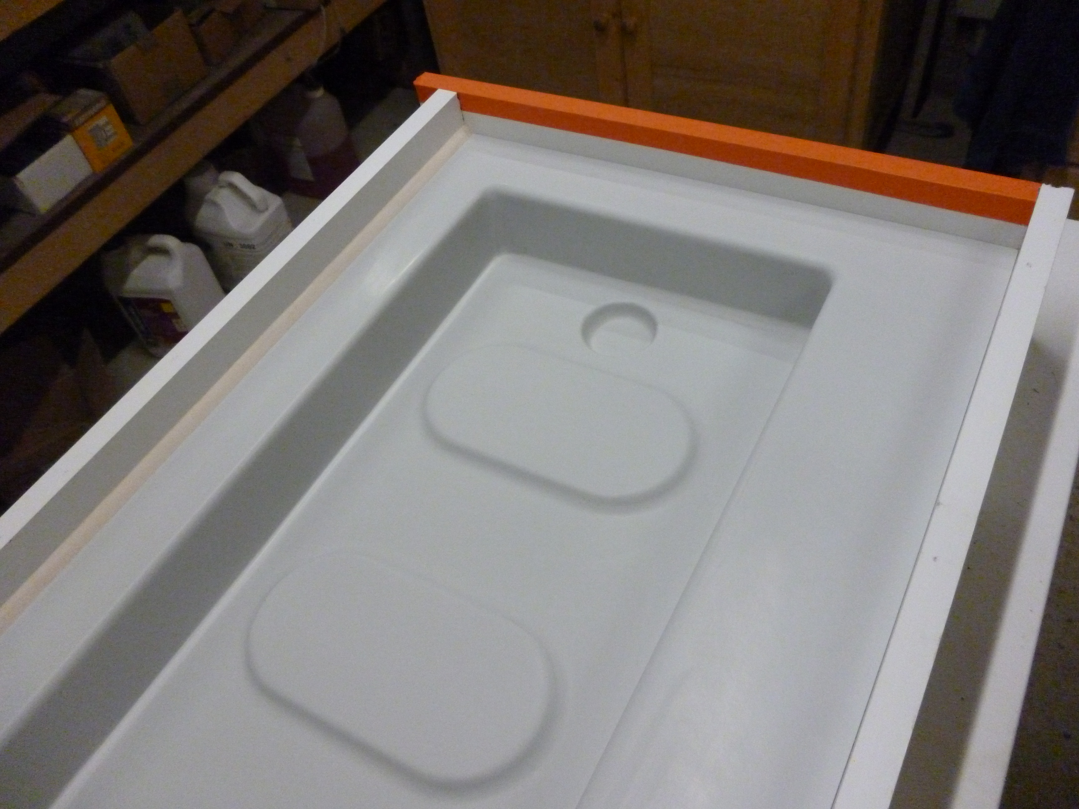 je vais refaire le bac en résine epoxy (je déteste le polyester), sachant qu'il est composé au fond de la partie support du Wc, et devant du receveur de douche. De plus, la partie douche comporte l'arrondi du lavabo qui prend bcp de place, donc je supprime le lavabo de la SDB (l'évier cuicine fera parfaitement l'affaire pour se laver les dents