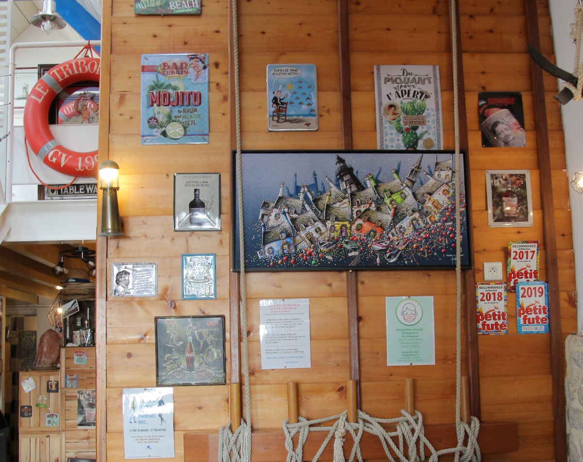 A midi le vent soufflait très fort ce jour là, nous nous sommes réfugiés pour déjeuner dans ce restaurant "Le Tribord", très bon accueil, tables à distance comme c'est recommandé et masques obligatoires sauf pour manger bien sûr ! un excellent repas : moules / frites et far breton. Le restaurant est décoré avec goût, le bar, comme vous le voyez, a la forme d'un bateau (normal ! "le tribord" !)