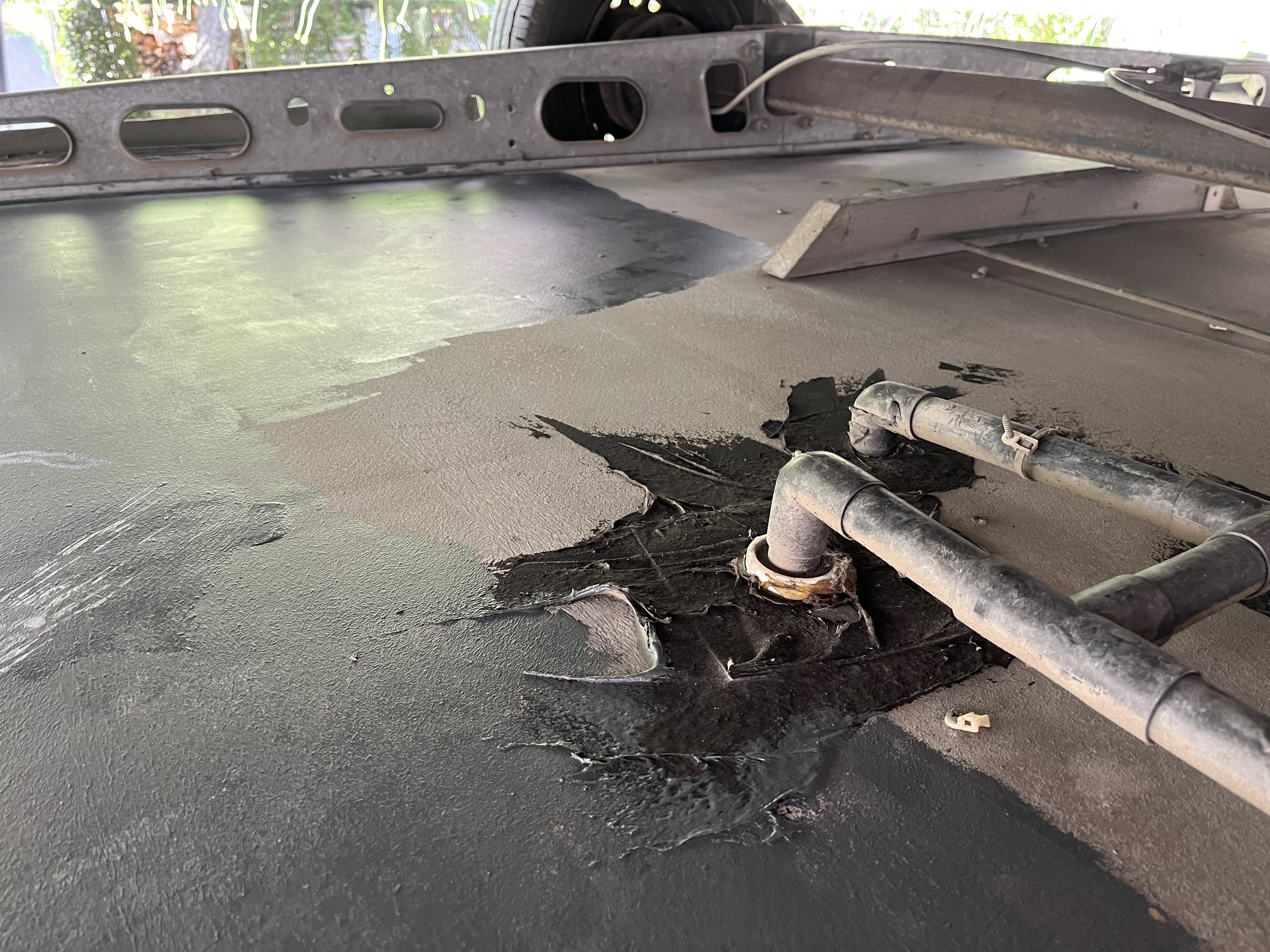 Et puis les tuyaux d’évacuation des eaux bougeaient beaucoup du fait que le bac était cassé… les mastics étaient tous craquelés et sec et surtout un morceau de plancher sous le coffre à l’avant qui commençait à montrer des signes de faiblesse… et puis vous me direz si tout ce mastic noir de partout c’est normal ou pas…