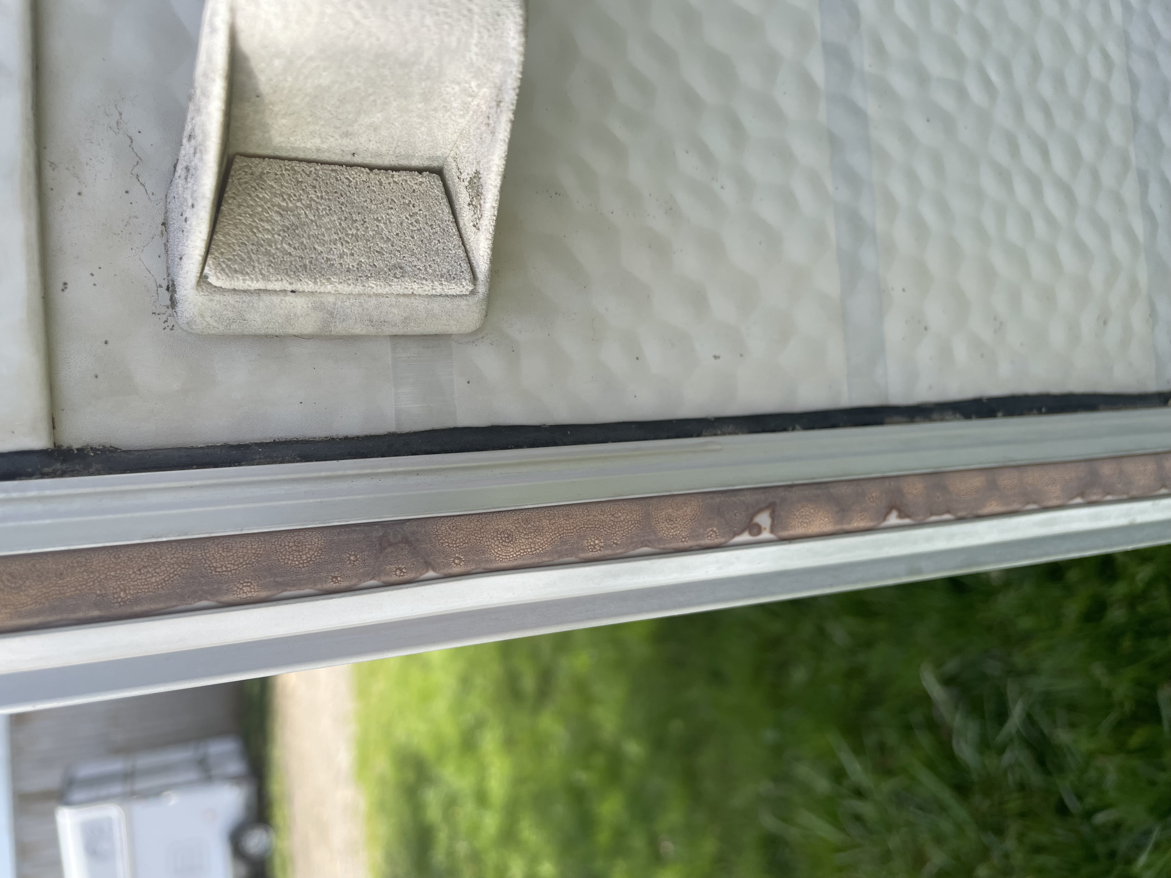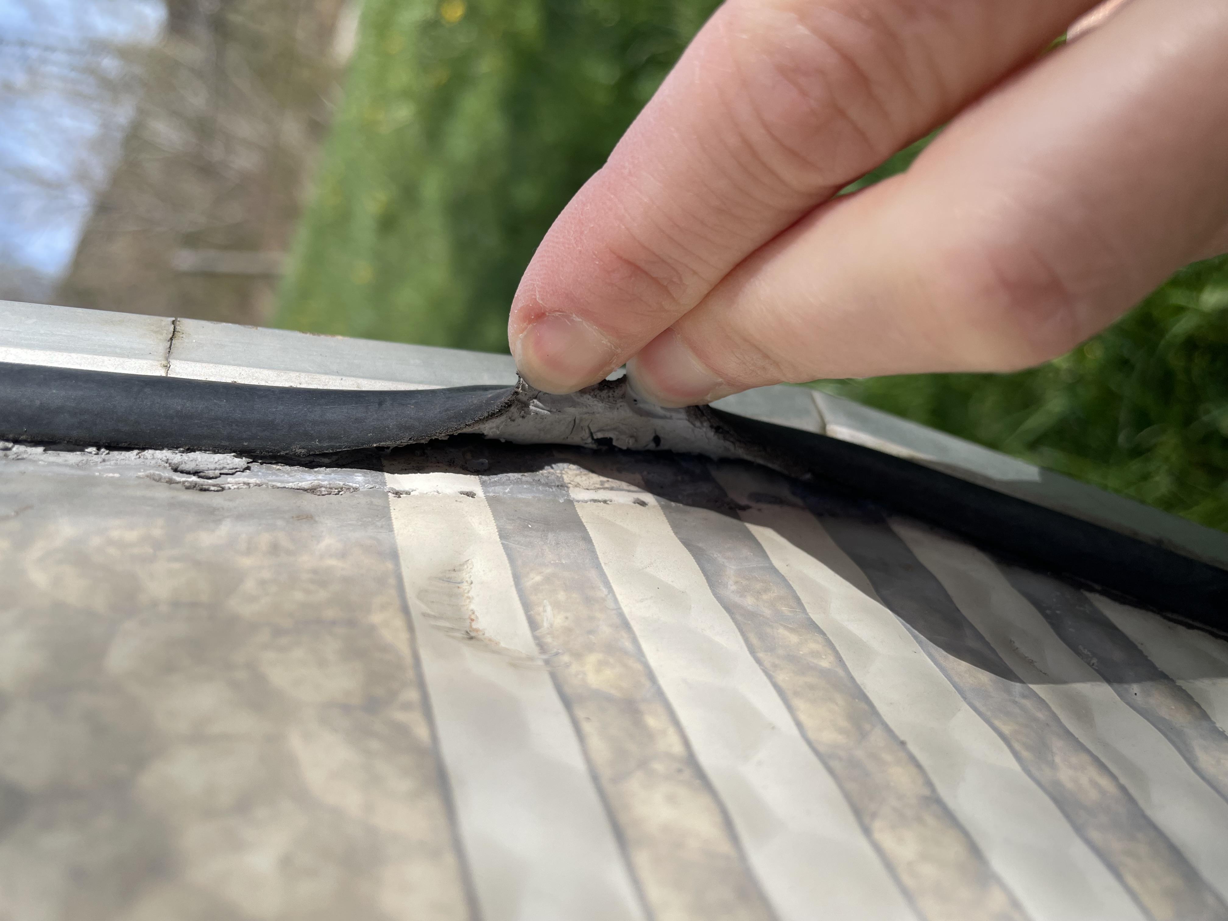 J’ai regardé le joint extérieur mais je ne sais pas trop quoi faire. Changer tout le joint noir du rail ? Refaire le mastic sous le joint ? Avec quel produit ? Le mastic actuel se décolle un peu et est noirci et s’effrite par endroit. J’ai déjà commandé le joint cache vis qui est bien cuit.
