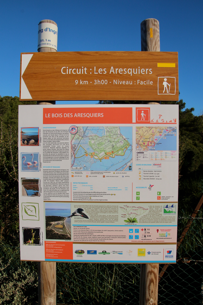 J'aurais voulu voir des flamants roses, il y en avait parait-il pas loin du camping, environ 2 kms près de l'entrée du circuit des Aresquiers (voir la photo du panneau), hélas je n'en ai pas vu :cry: , ils étaient déjà partis. Si nous avions fait halte en mars ou début avril je pense qu'on aurait pu en voir !