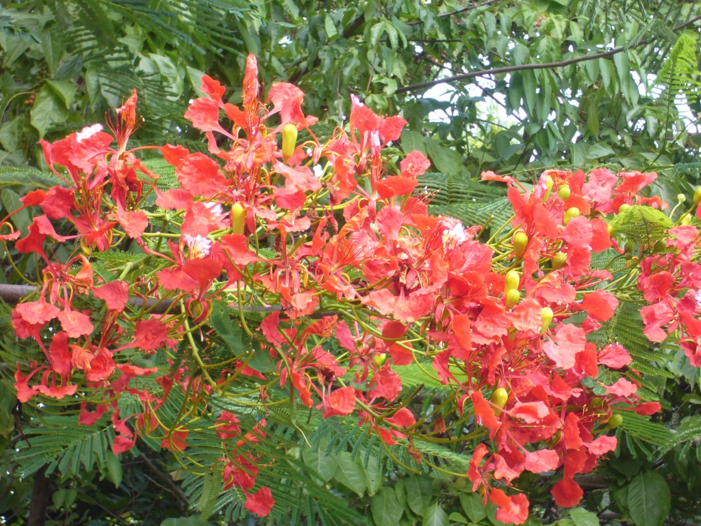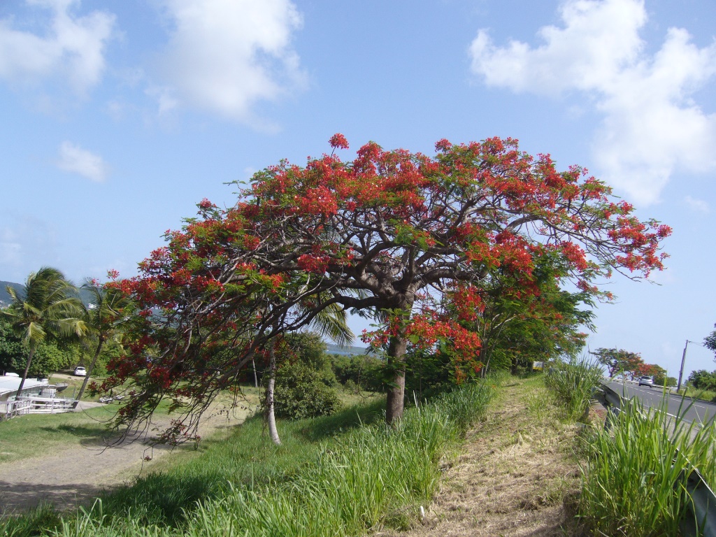 Le flamboyant, originaire de Madagascar, est très courant dans les Antilles. C'est un arbre décoratif, qui peut facilement atteindre 10 mètres de hauteur.