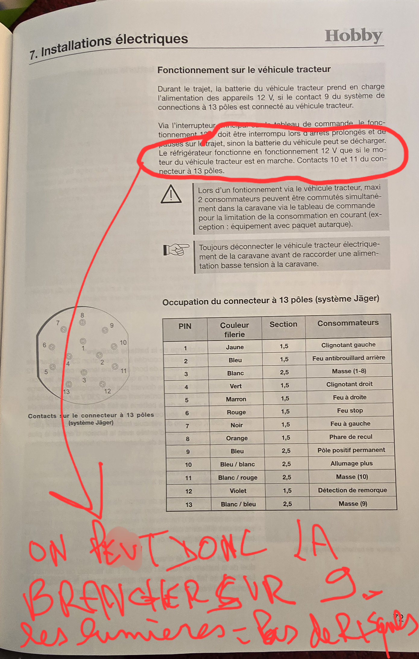 Après, avec une 13 broches, on a les 2+ dans la caravane: Celui après-contact et le permanent. Donc autant mettre l'éclairage sur le permanent et le frigo sur le + APC