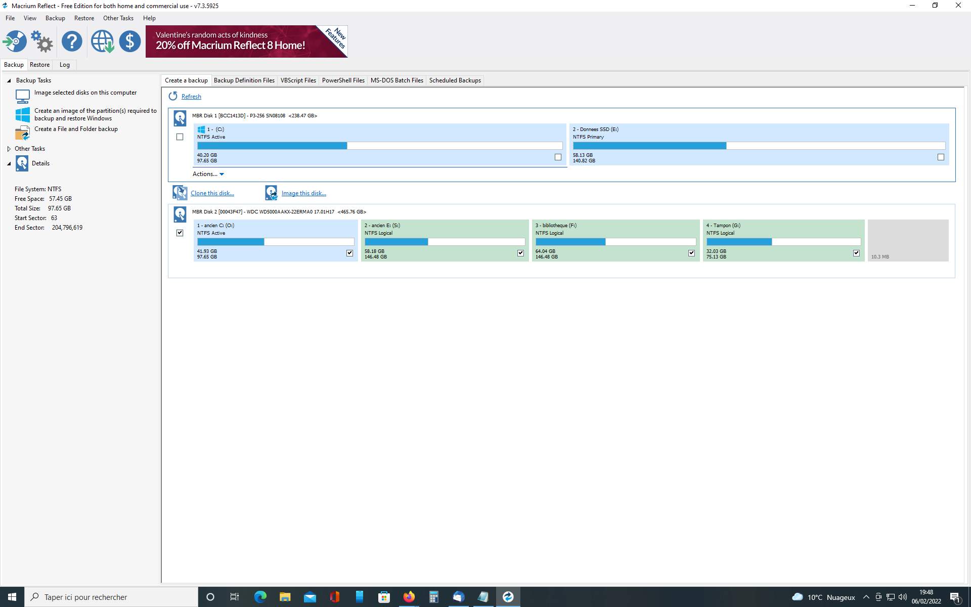 voici en exemple l'organisation de mes disques j"ai un disque SSD 256Go partitionne en deux (C et E) et mon ancien disque HDD où je stocke les photos, les sauvegardes provisoires....
