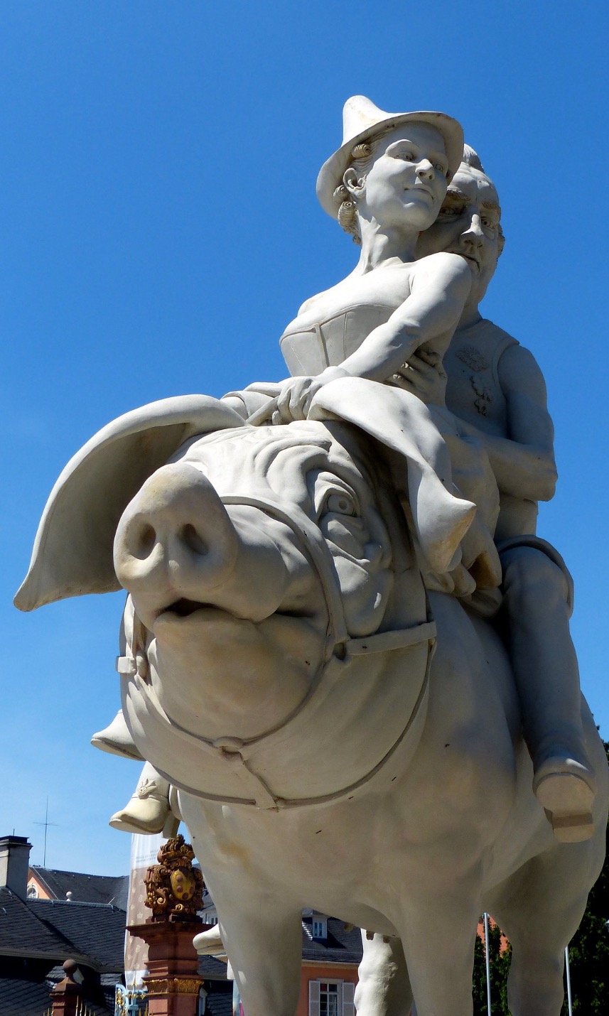 La sculpture intitulée "Le cochon chanceux de Schwetzingen" par l'artiste Peter Lenk qui montre le Prince Charles Théodore avec une maîtresse à l'extérieur de l'entrée au palais à Schwetzingen des couches lavables oeko tex