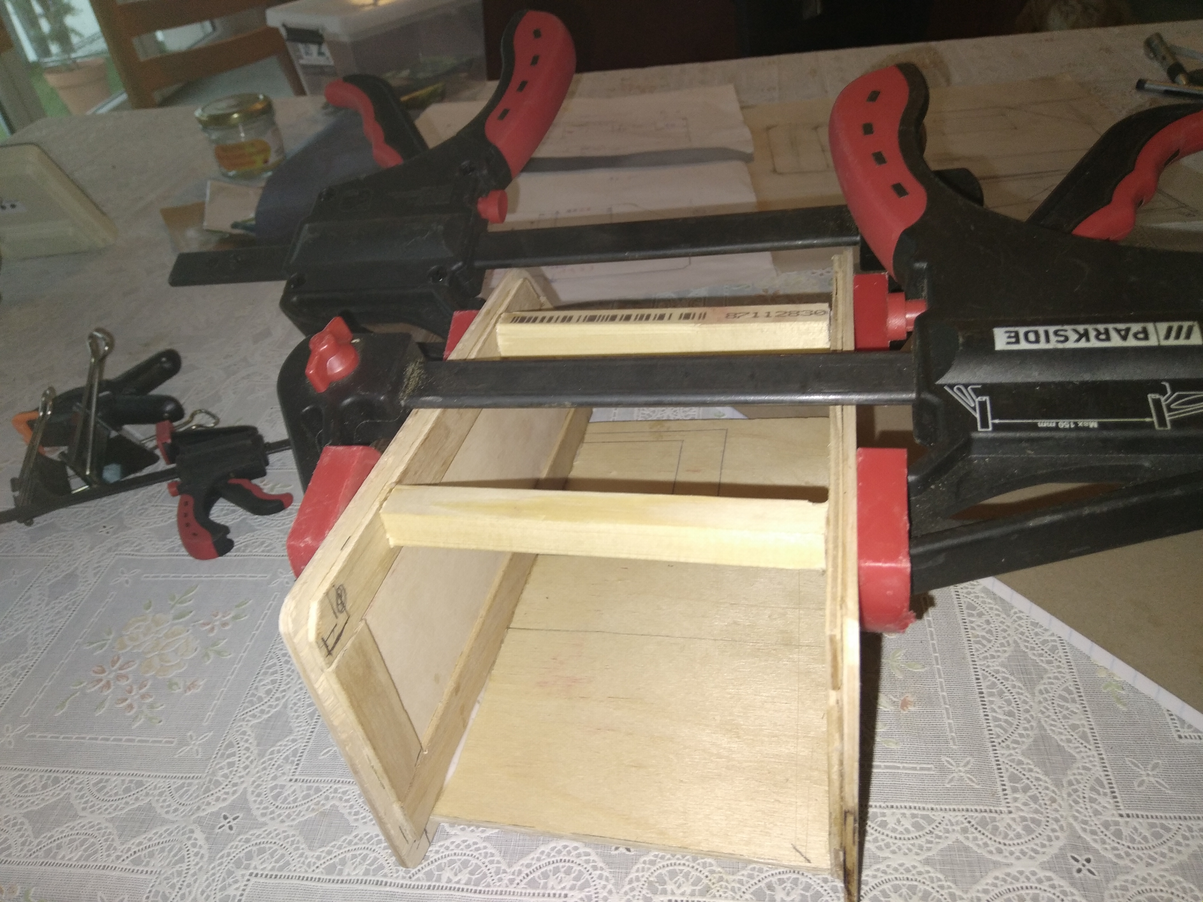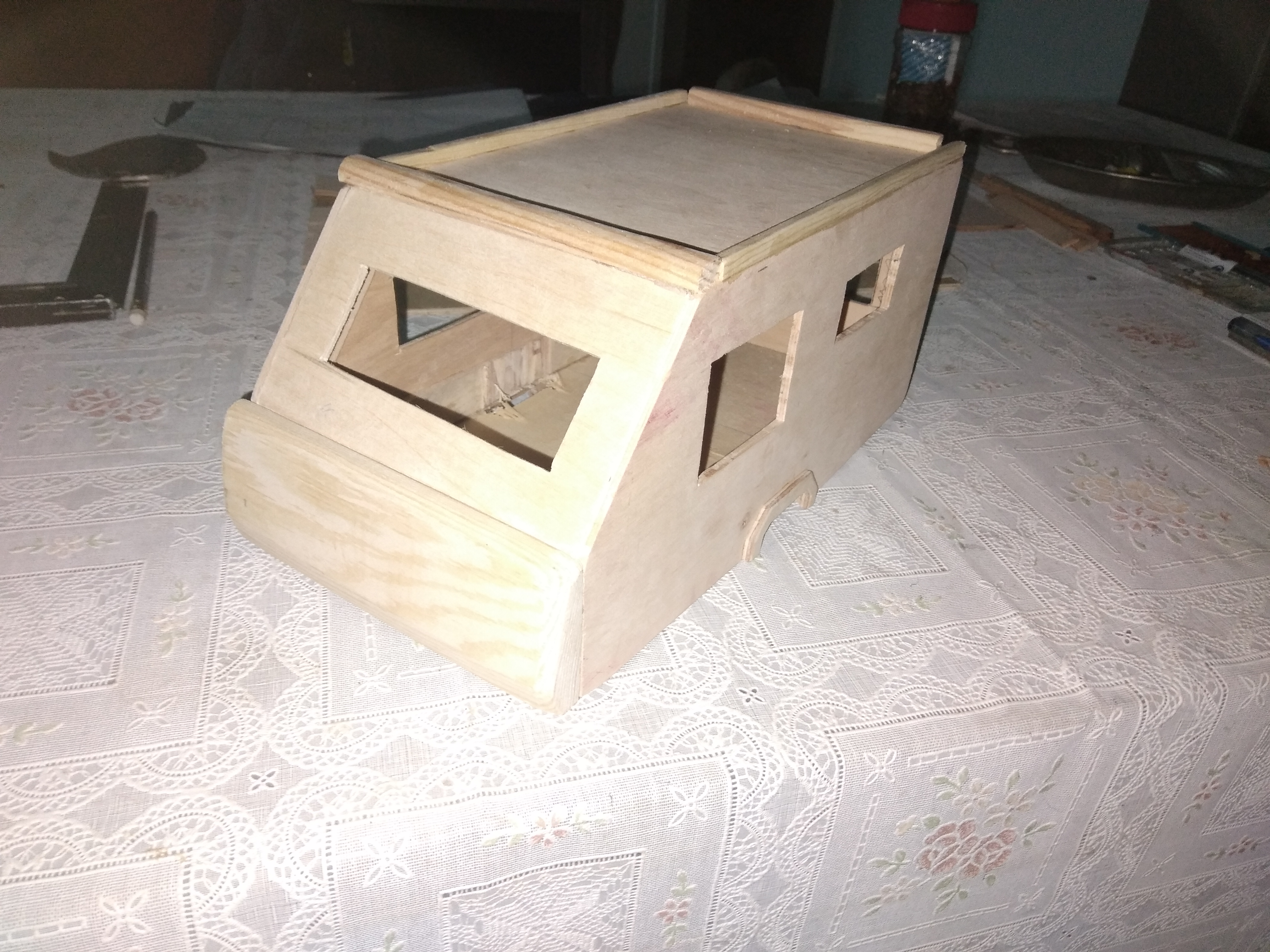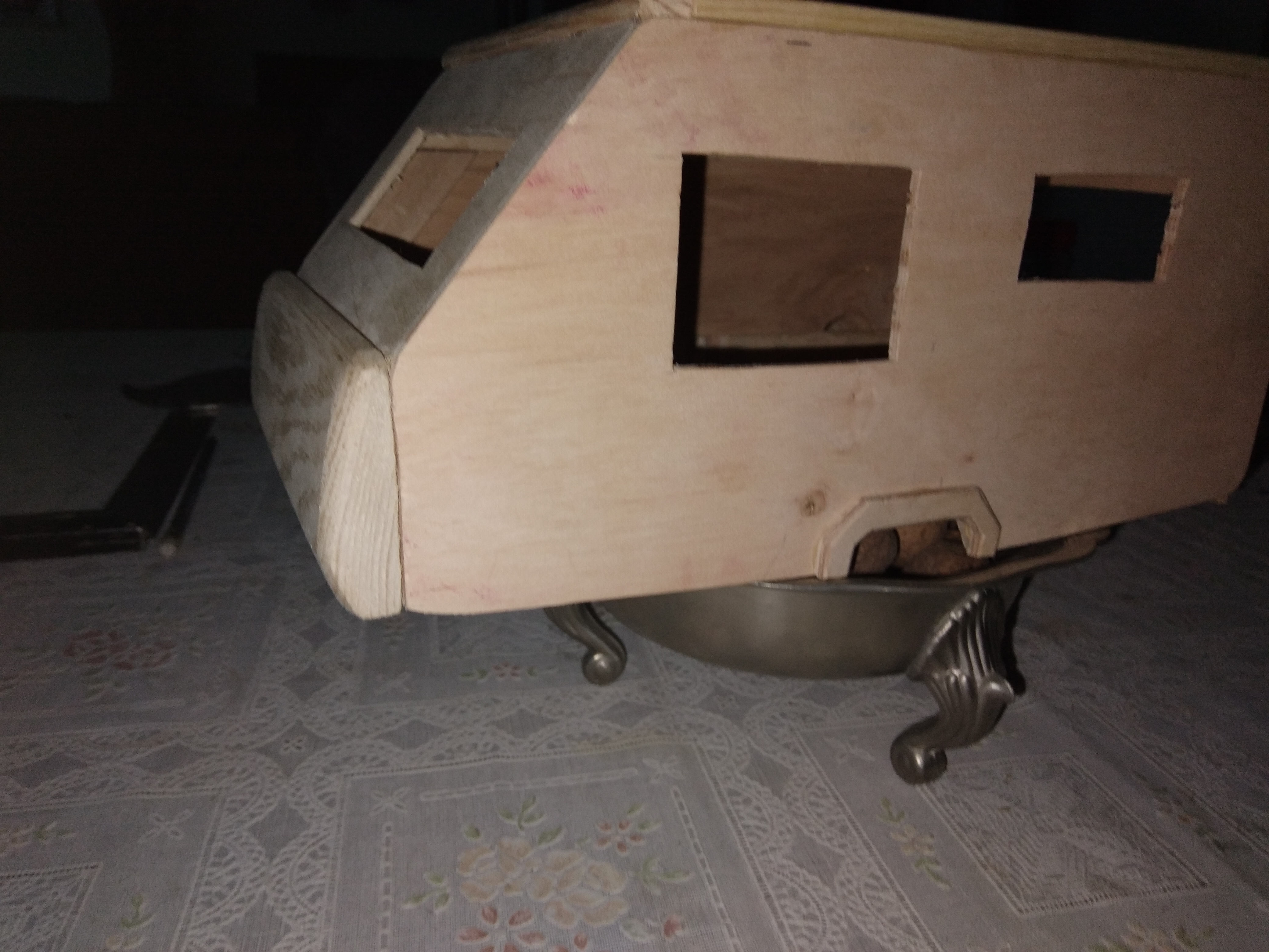 La caisse de la caravane miniature avance très bien bien du fait que le temps n'est pas au top, j'ai travaillé toute la journée dessus. La caisse est presque finie, reste quelques finitions, et puis, ponçasse au papier de verre très fin.