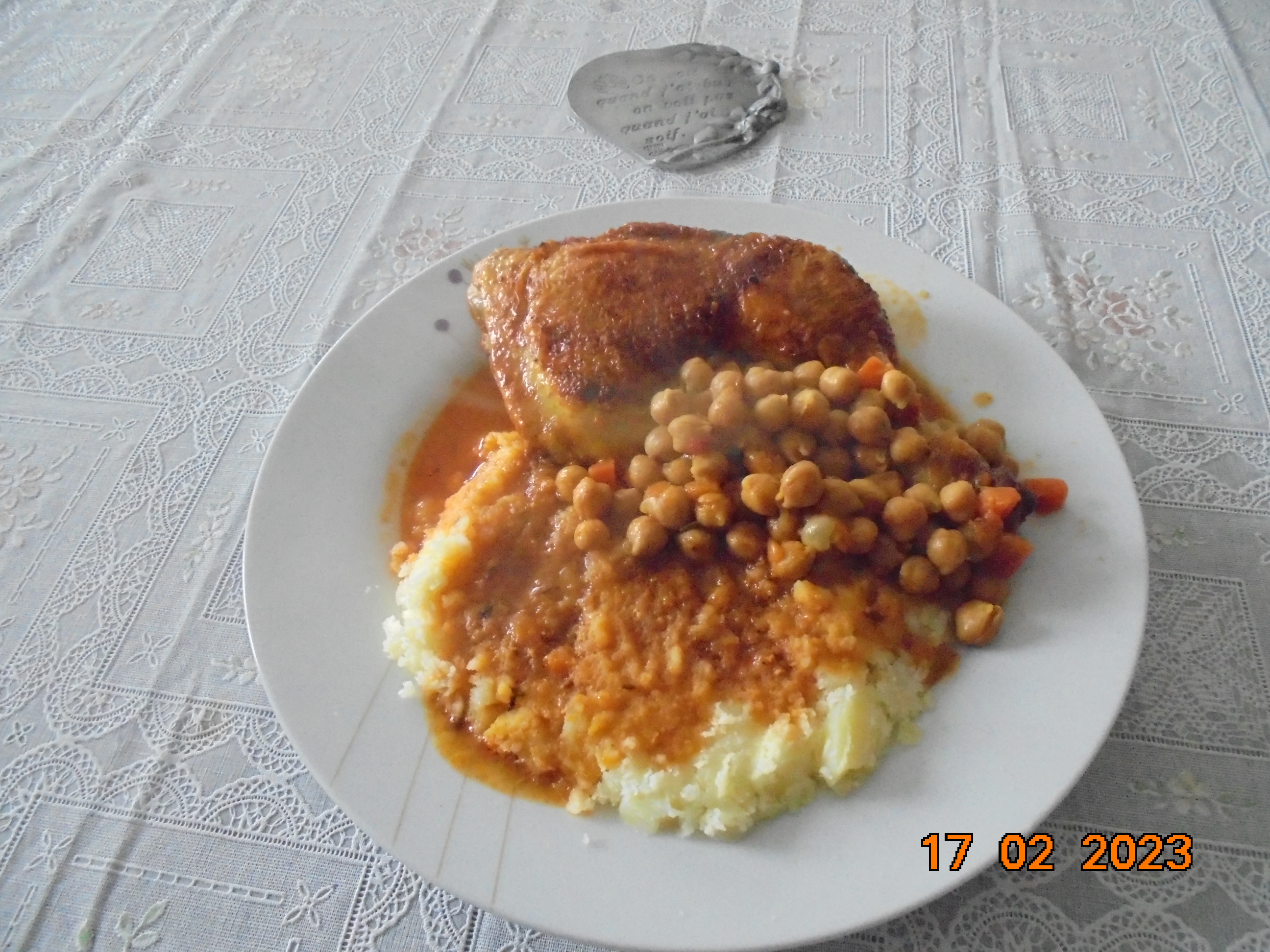 Aujourd'hui, pour ce midi, c'était une belle cuisse de poulet au paprika, avec des pois chiches et une purée maison. Encore bien régalé, ===8 ===8 Bravo Roland. ===8 ===8