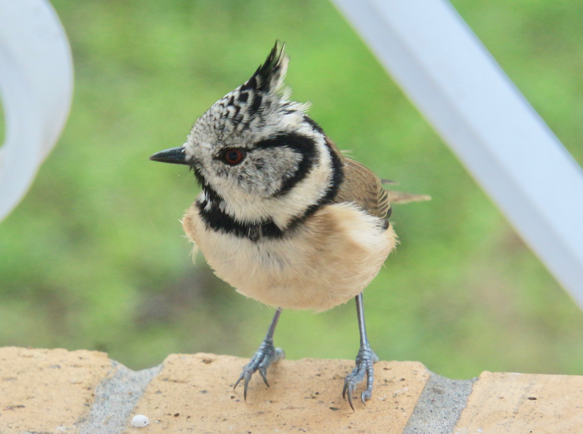 Pendant que je suis à l'ordinateur, en train de regarder Lacaravane.com, voici à la fenêtre la jolie mésange huppée qui vient me dire bonjour, et manger quelques graines !