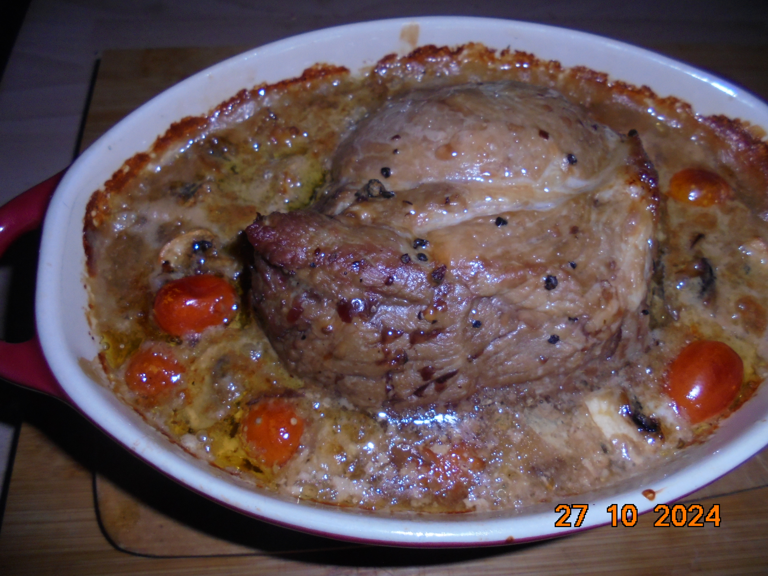 Aujourd'hui, j'ai cuis au four un excellent roti de porc dans l'épaule avec des champignons frais et quelque tomates cerises qu'il me restait et crème. Avec ça, écrassée de PDT et deux verres de Morgon.