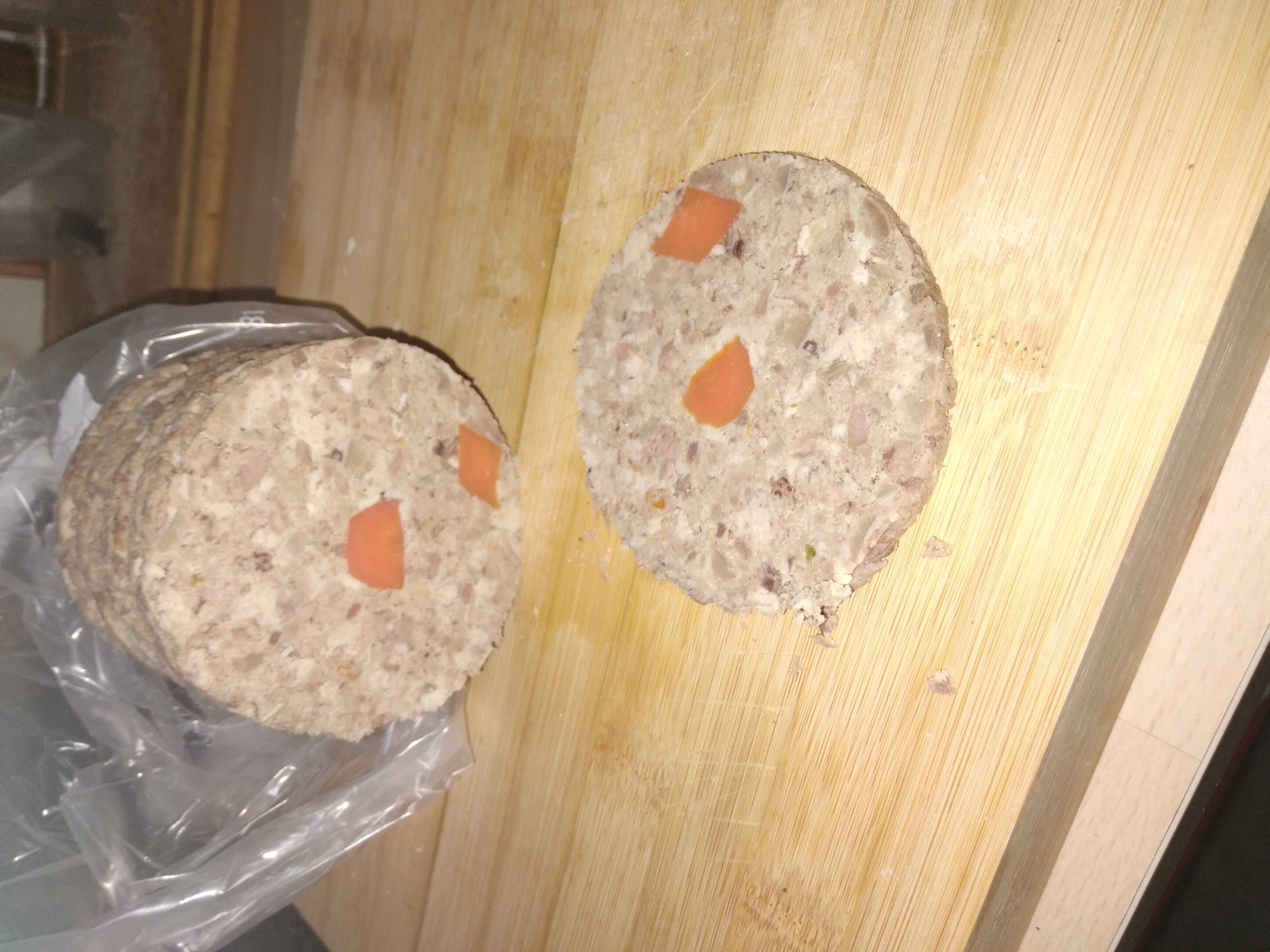 Ce matin, j'ai fait un espèce de saucisson avec deux gros jarrets de porc et quatre langues de porc. Je n'avais jamais fait ça, j'ai tenté et réussi.