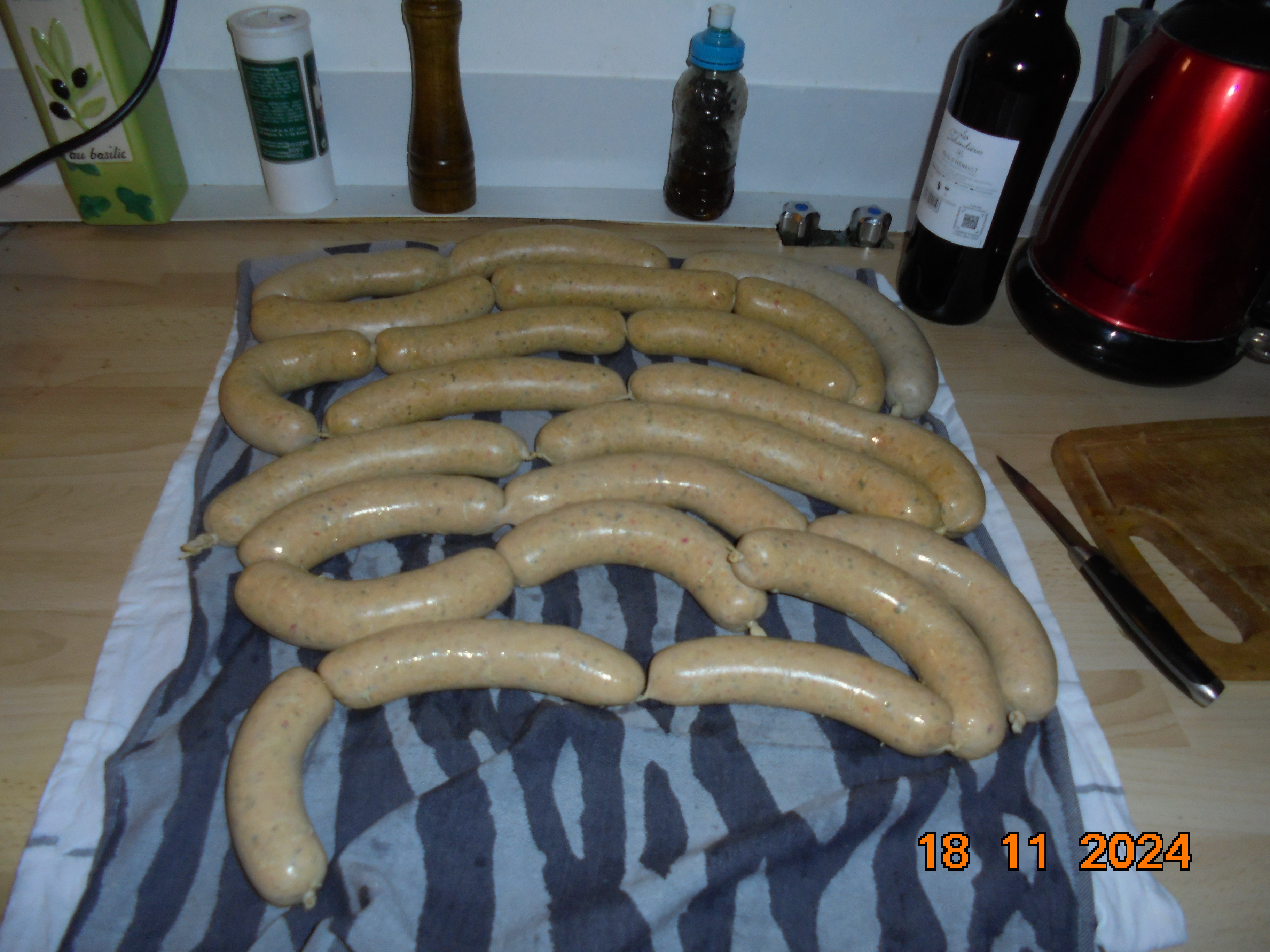 Hier, j'ai fait 6kg 525g de boudin blanc de poulet. La moitier avec des chantrelles et trompète de la mort et l'autre moitier, avec des poivrons et piment d'Espelette.