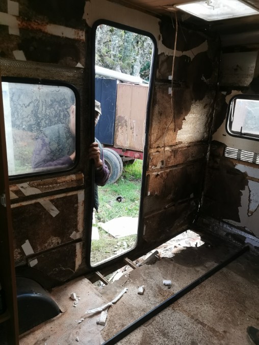 les garçons ont commencer a nettoyer ma chariote , il y a le plancher juste devant la porte d entrée qui et pourri sur 50 cm a l intérieur et sur 1.5 mètre de long , il y a le panneau gauche en entrant qui et abimé , mais pas d importance car il va être enlever ,pour agrandir la porte de 80 cm ,un peu le panneau sur la droite , mais ce n est pas méchant a pars le polystyrène qui et taché mais sec donc on ne le touche pas ,