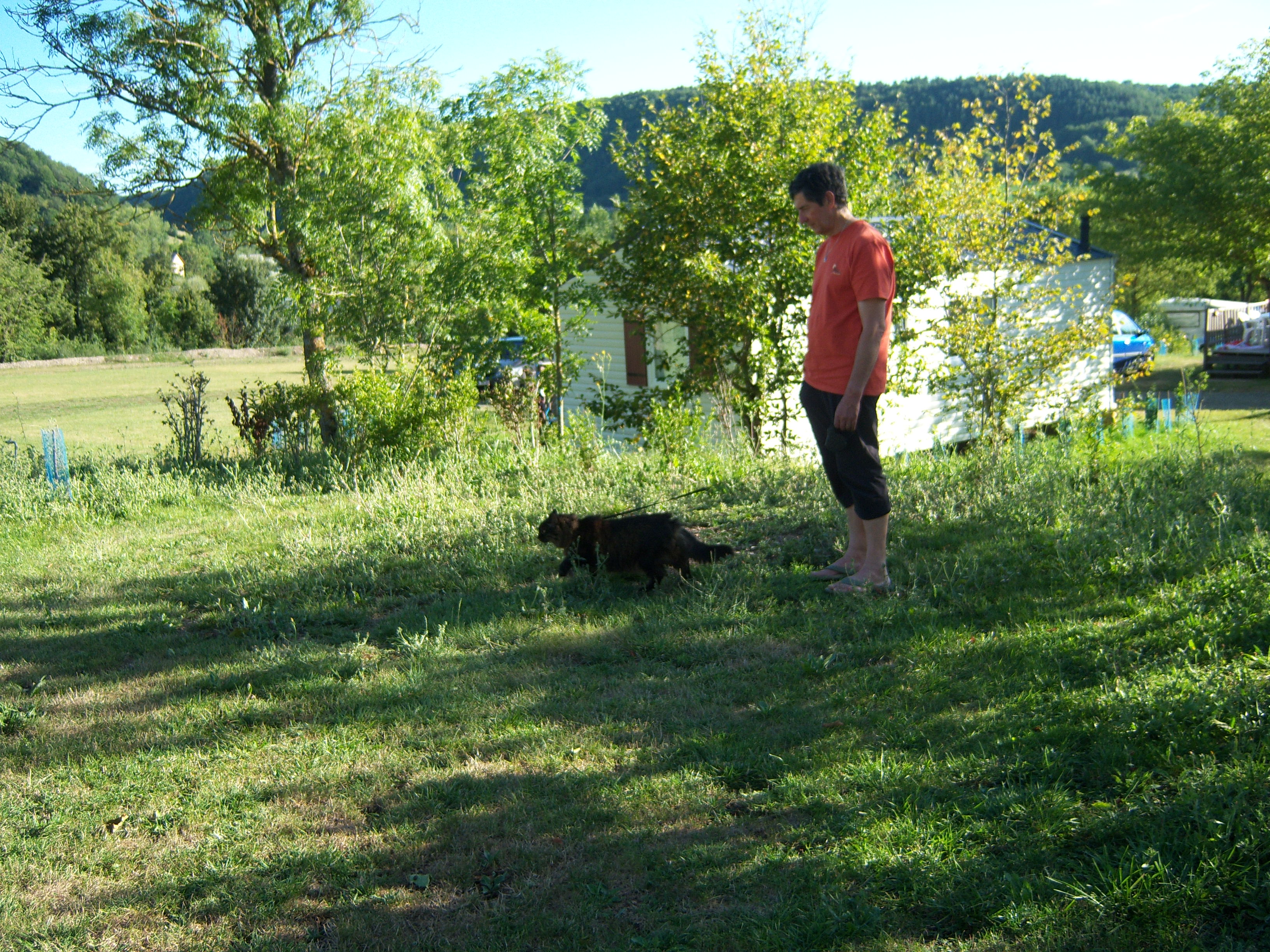 et en promenade avec sa maitresse explorait le camping sans crainte des gens et des chiens