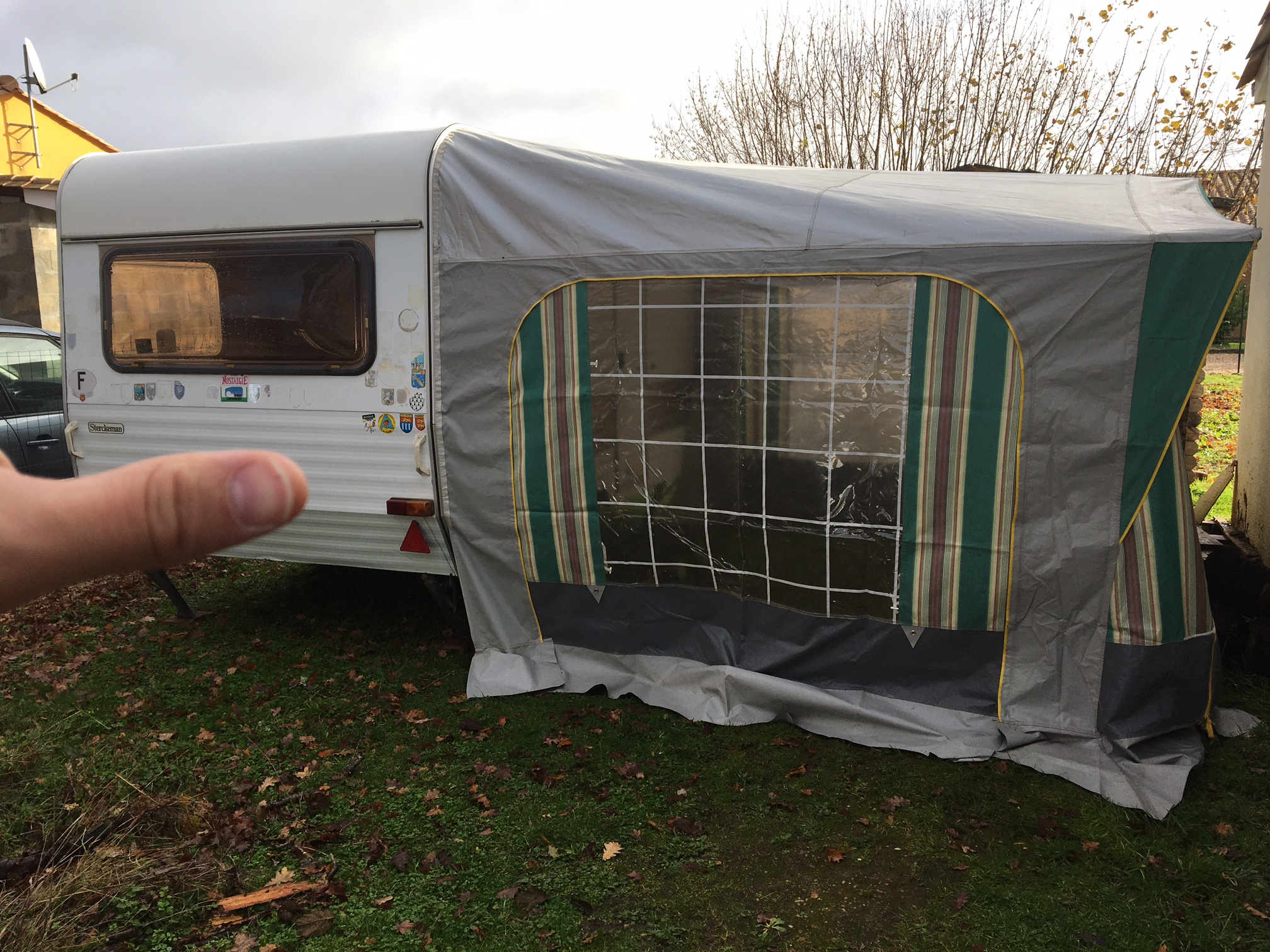 Coté positif, j'ai recuperé le auvent et monté. il est parfait, petit bémol, je n'ai pas de rail pour la jupe mais des bouton pression sur la caravane. je vais en "clipser" sur la jupe pour etre complet.