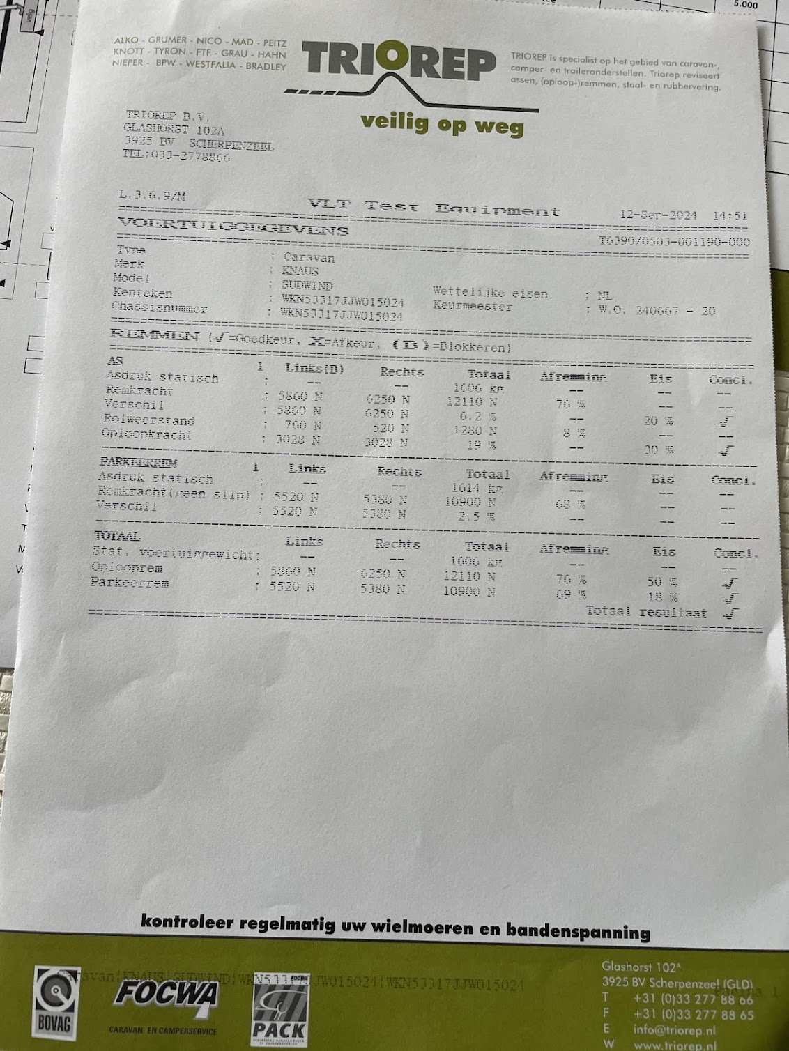 Cet atelier agrée Al-Ko en Hollande pour le Bénélux a aussi réaligné le carrossage , pinçage , passage au banc du système de freinage, pesage ... puis passage au CT hollandais .