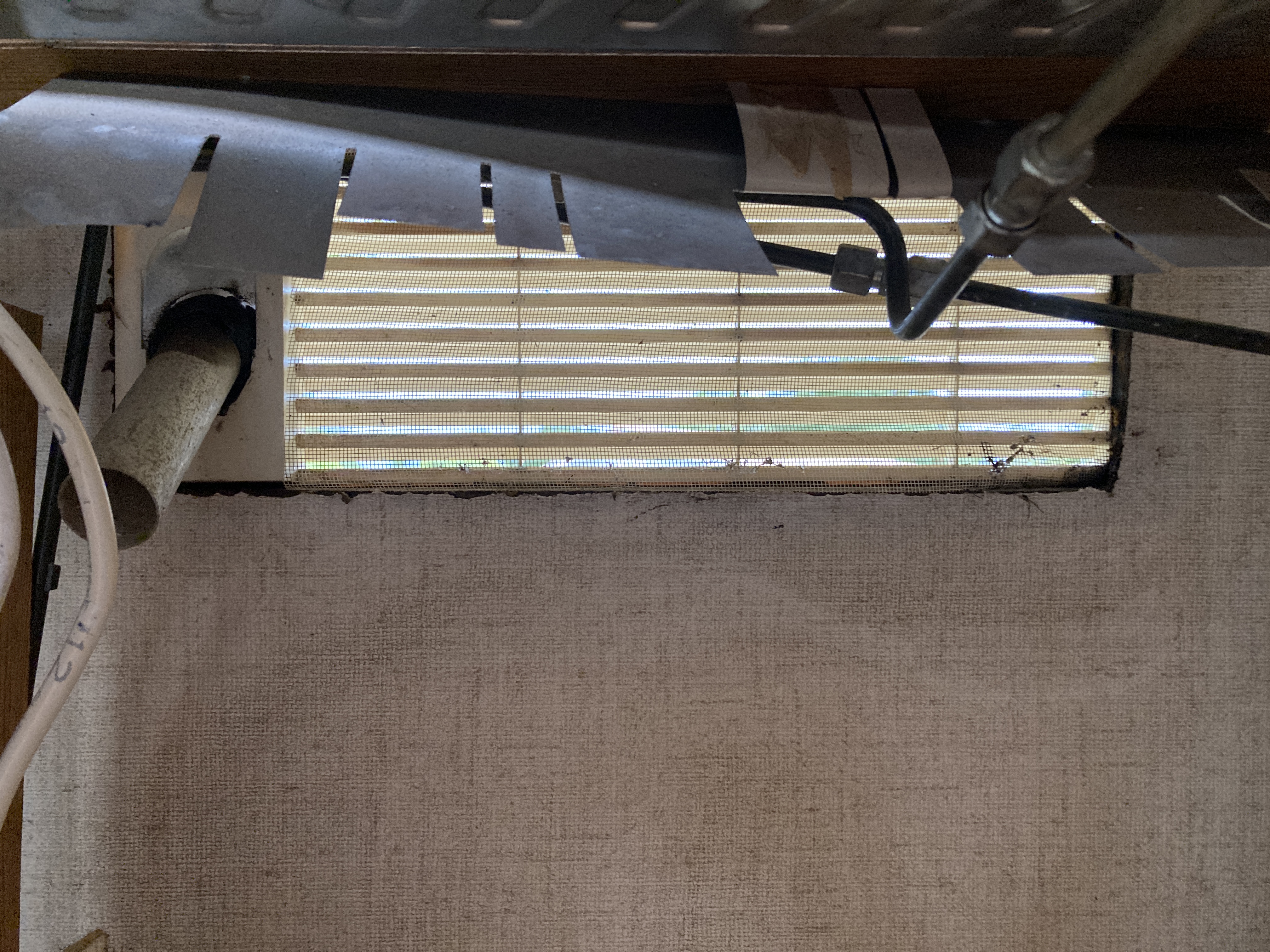 La grille haute est sous l'évier mais on ne la voit pas sur la photo, et l'aération basse est au plancher, sous la serpillère, j'essaie un autre point de vue.