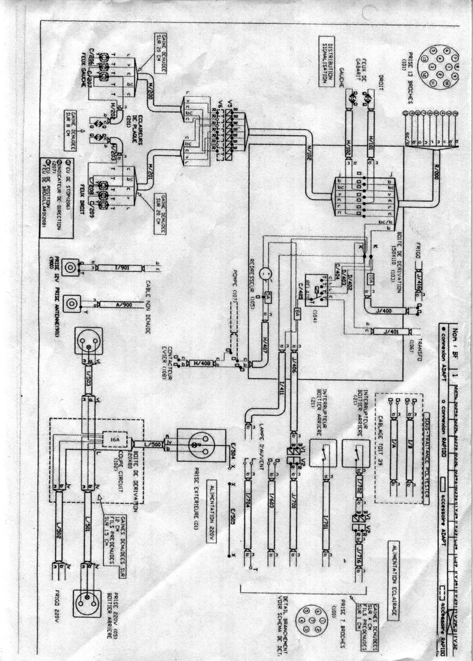 J'ai ajouté tout de suite un transfo dans une boite supplémentaire, avec relais et redresseur, pour avoir "tout qui marche" même au camping et sur 220v. Ensuite, quand j'ai changé la prise 7 broche en 13, j'ai séparé les masses des feux de celles du frigo/pompe/luminaires intérieurs, pour en finir avec les pbs de feux faiblards quand le frigo marche en 12v (gros consommateur).