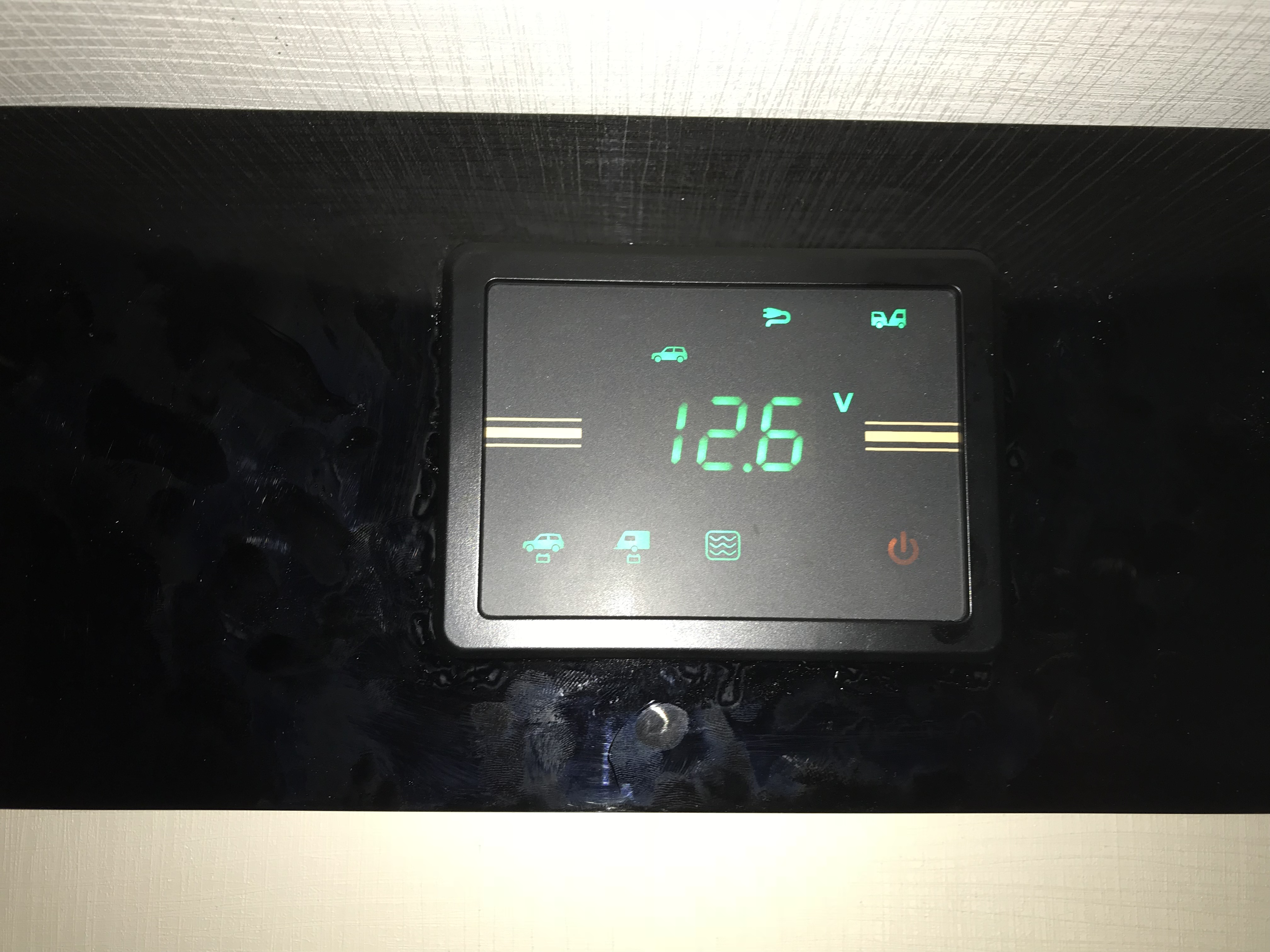 Sur mon panneau de contrôle, j'ai bien le branchement 220 du camping, mais j'ai également le branchement voiture. En plus de ça, le panneau de contrôle arrive à me donner le voltage de la batterie voiture, et tout ça sans être branché,