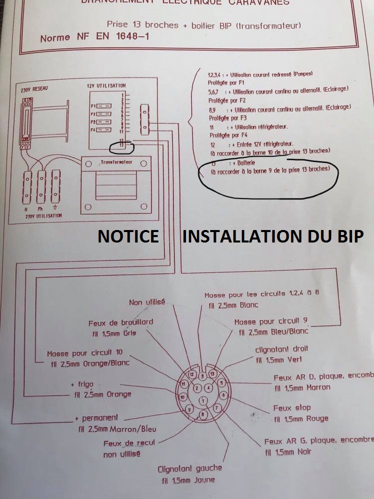 Sur le schéma électrique (Notice Boitier BIP en photo jointe) de la caravane il y a l'emplacement 13 ou c'est marqué :
