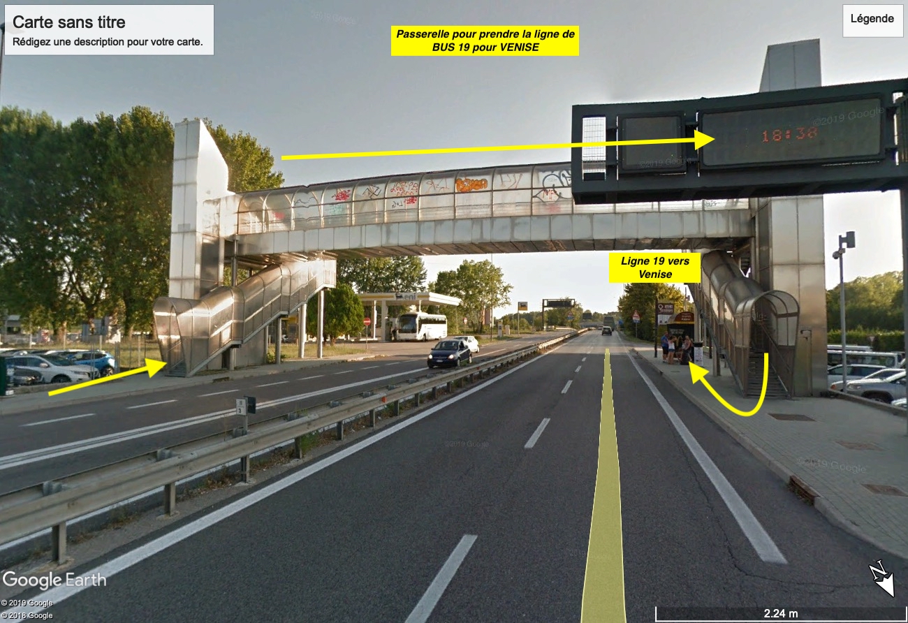 Dans le camping on a des panneaux qui nous indiquent la sortie vers le bus à prendre pour aller à Venise, petite sortie différente de la grande entrée, on fait quelques pas hors camping et une passerelle qui enjambe la route nous permet de rejoindre l'arrêt de BUS, qui se trouve sur le trottoir d'en face,
