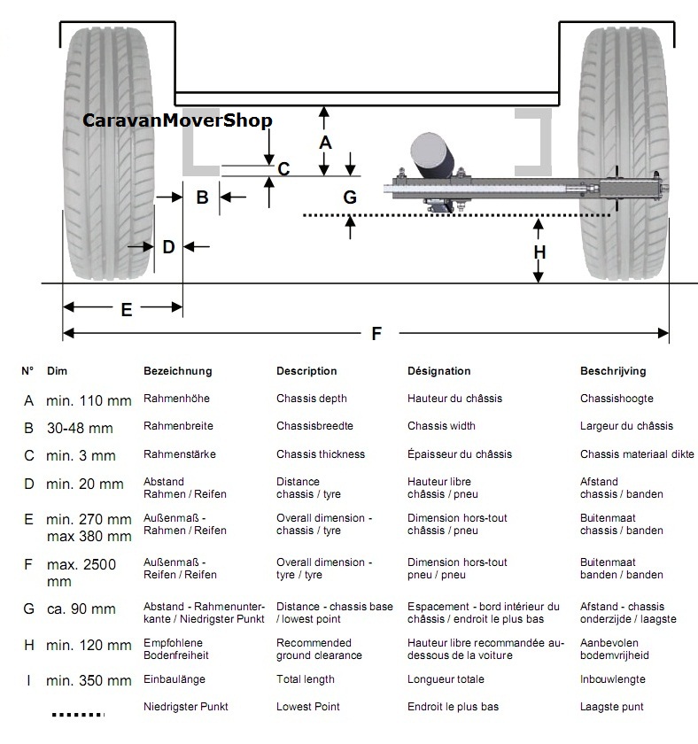 suivant la dimension du chassis, il faut que le moteur du mover puisse passer sous le planché de la caravane, et parfois il faut mettre une cale d'epaisseur