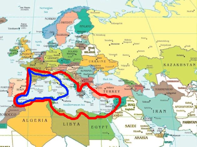 Mon rêve de voyage avec plusieurs attelages est le suivant : un tour de la mer Méditerranée complet (parcours rouge sur la carte)
