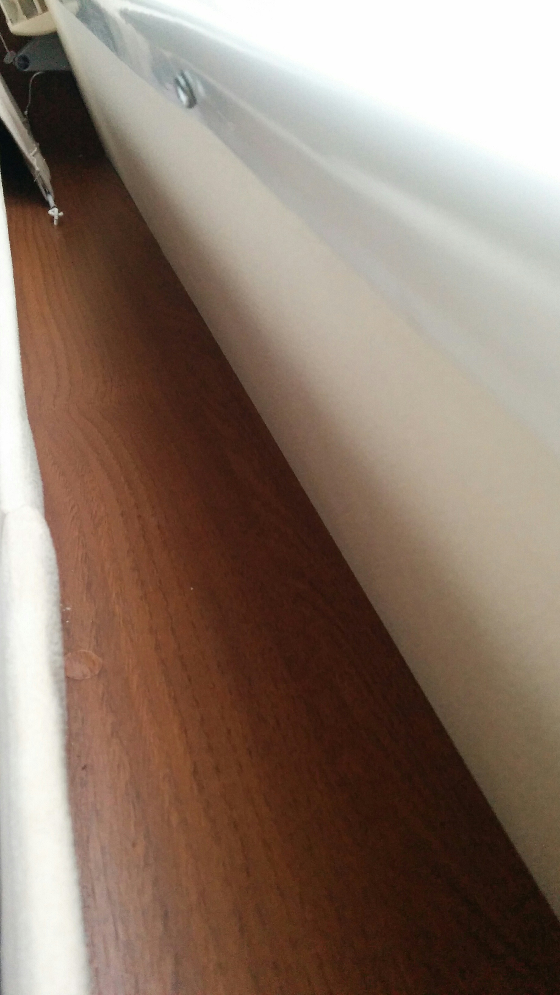 Sur la première photo, on voit bien la réalisation : sous le joint noir se trouve un bandeau en PVC qui revient sur la paroi et la tête de lit (complètement trempée)