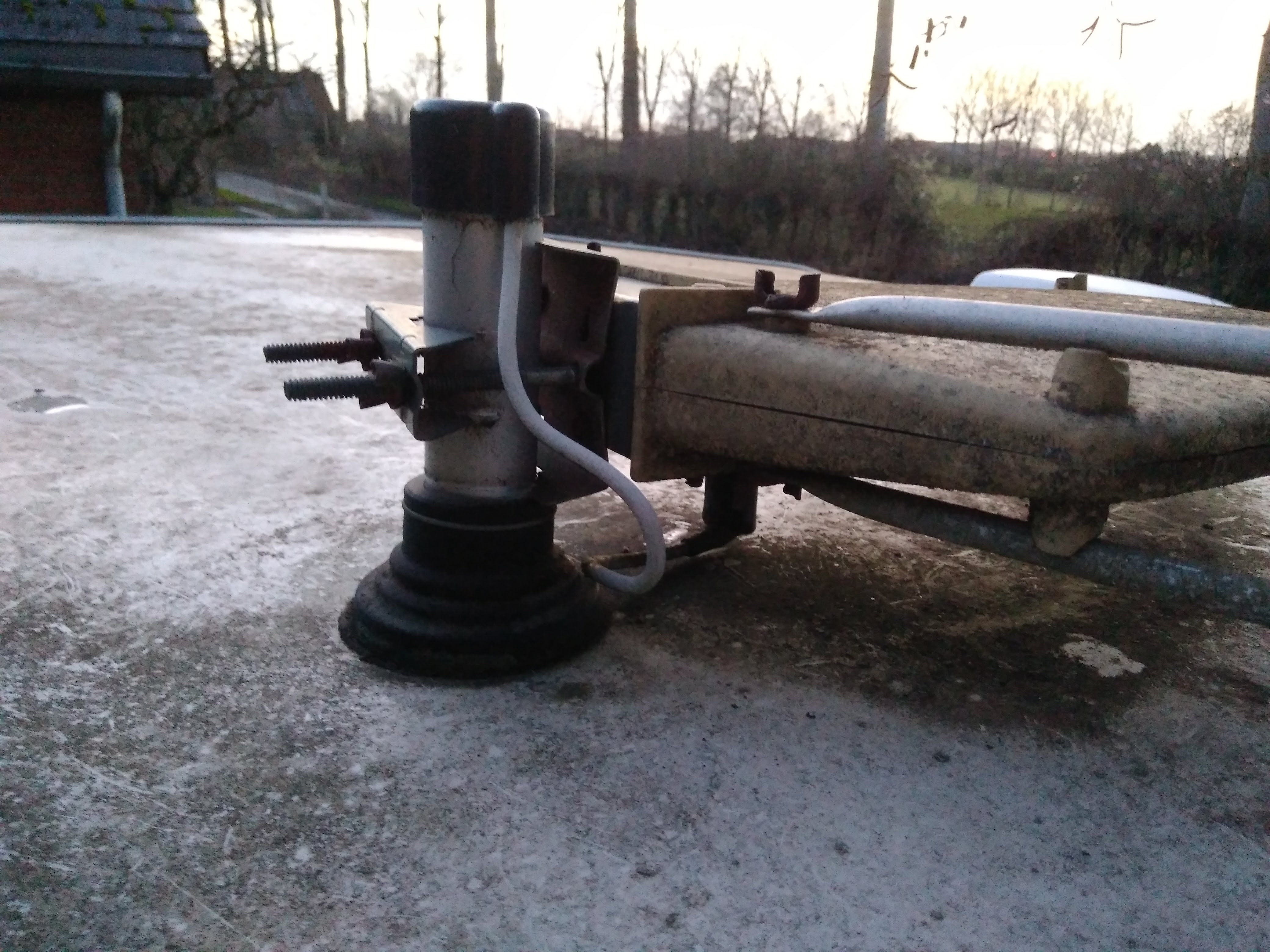 bon, j'ai été faire des photos et je suis monté voir avec une échelle, ce que je croyais être un couvercle n'en est pas un, ça fait partie intégrante de l'antenne, qui au final doit être une hertzienne omnidirectionnelle avec un seul câble coaxial qui sort .