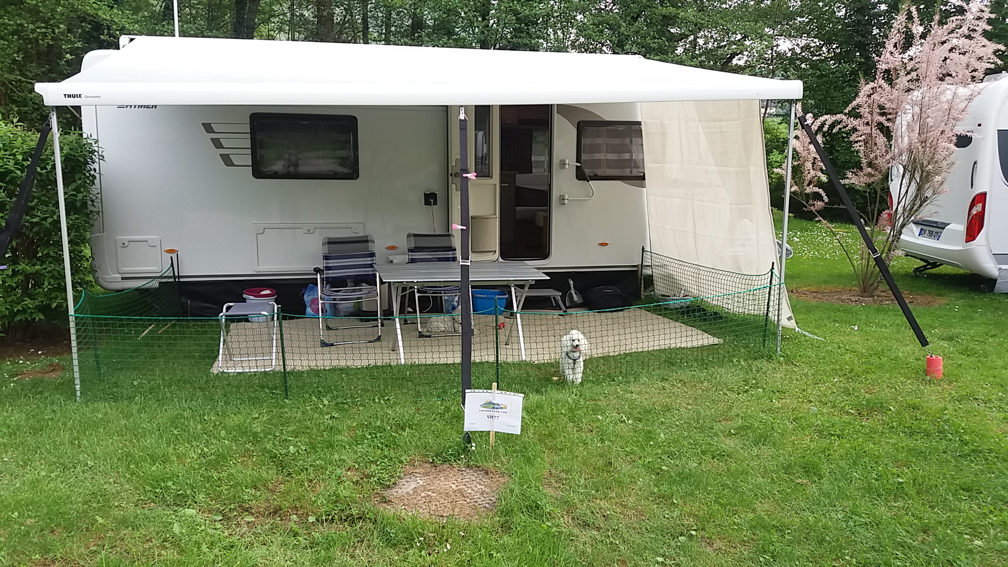 (Enfin, d'autres caravaniers utilisent un parc; càd qu'ils font un montage de clôture tout autour de leur auvent... Si ton chien ne saute pas, ça peut être bien pratique ! ça donne de l'espace et une semi liberté, pas de longe à dénouer... )