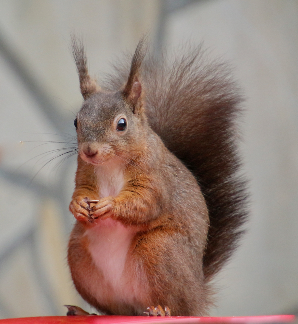 Je ne voie pas d'écureuils, bien qu'il en ait dans la propriété, comme il y a des ramiers et des chouettes, seuls les pigeons viennent quelle que fois picorer des graines au sol. Il faut dire que nous résidons à la campagne et à plus de 500 mètres de notre voisin le plus proche. Cordialement