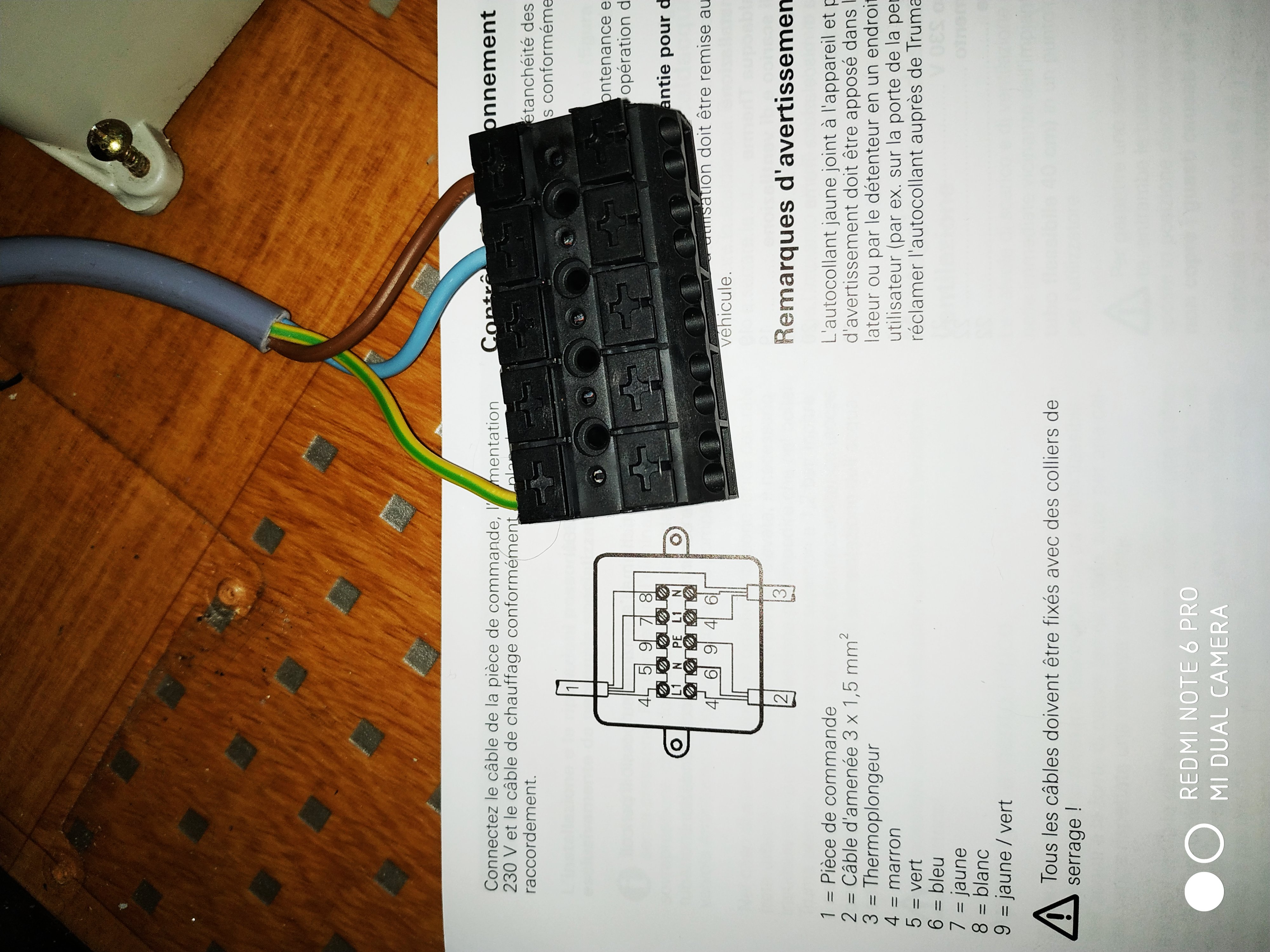 Tu raccordes suivant le schéma: le cable 1 est celui qui vient de ton interrupteur de commande (respecte les couleurs), le 2 c'est le câble d'arrivé, et le 3 c'est celui qui vient du Truma, et tu mets tout ça dans le boitier Legrand. Il suffit de suivre le schéma, ...tu peux le faire