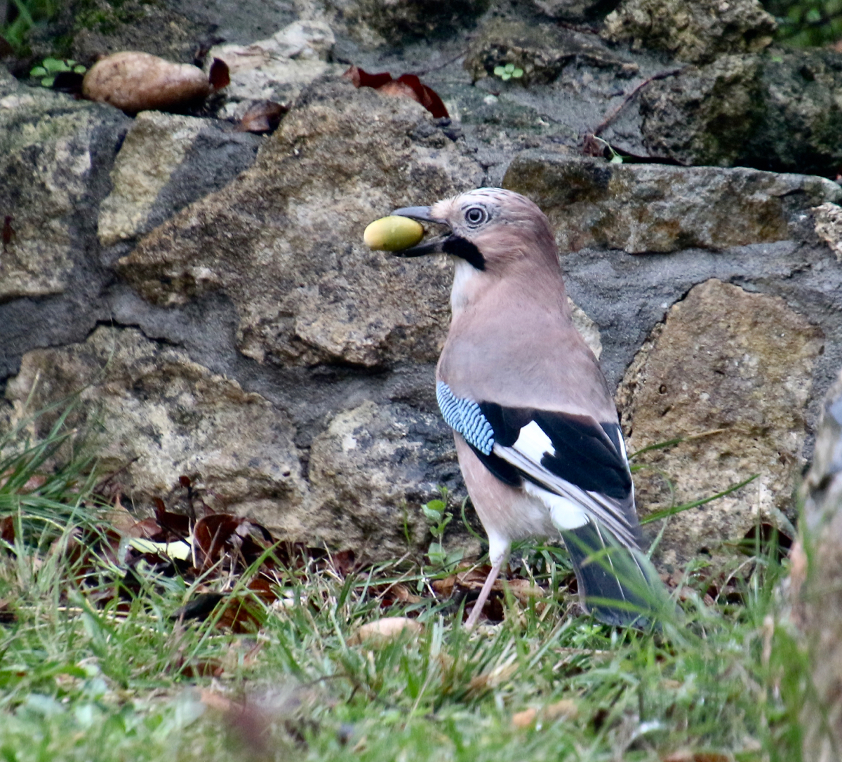Ce geai est venu dans notre jardin pendant qu'on déjeunait, c'était la première fois qu'il venait si près dans mon jardin, il est venu enterrer un gland qu'il a pris dans le chêne de mes voisins pour se faire une réserve pour l'hiver ! J'espère que je vais le revoir !