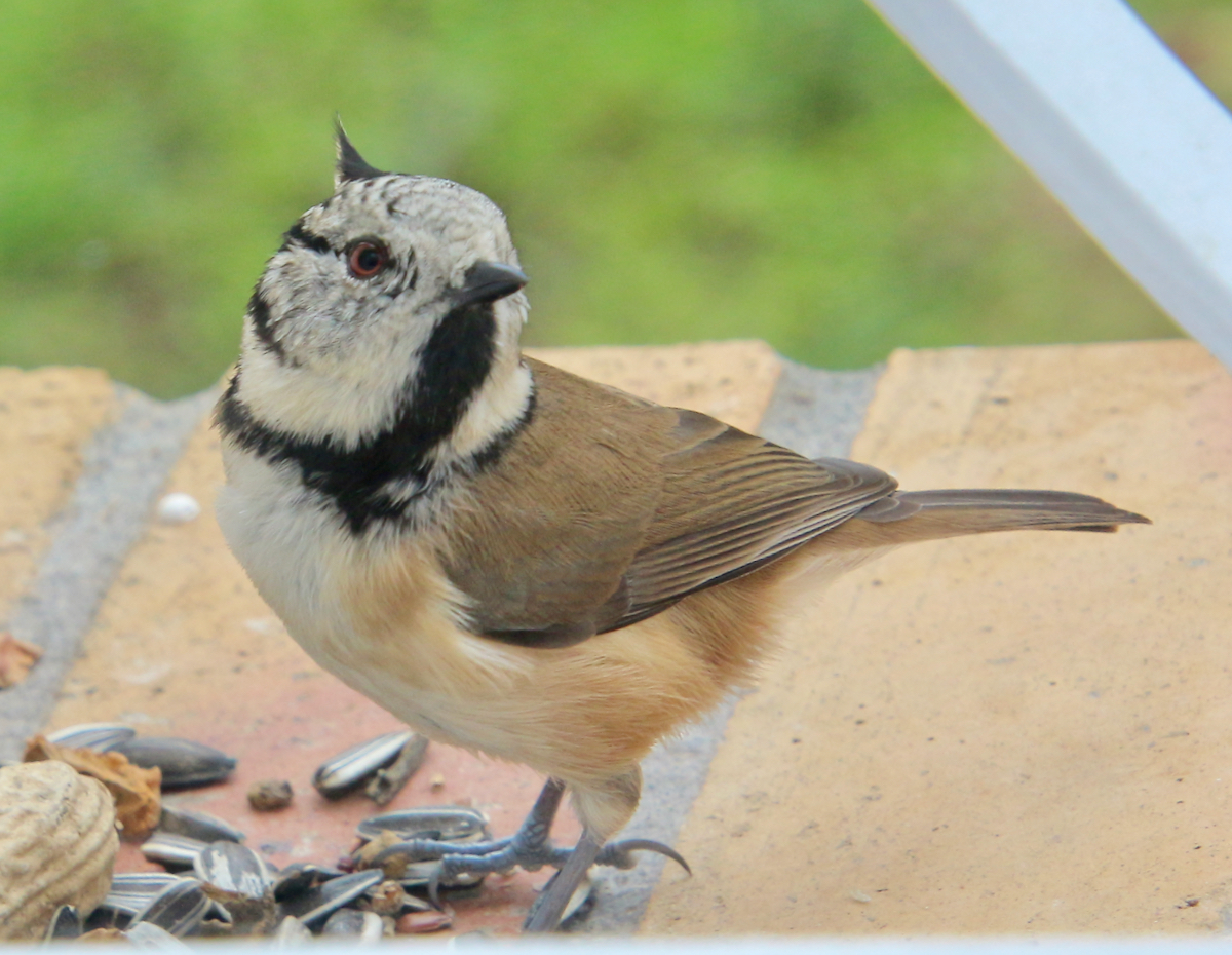 Pendant que je suis à l'ordinateur, en train de regarder Lacaravane.com, voici à la fenêtre la jolie mésange huppée qui vient me dire bonjour, et manger quelques graines !