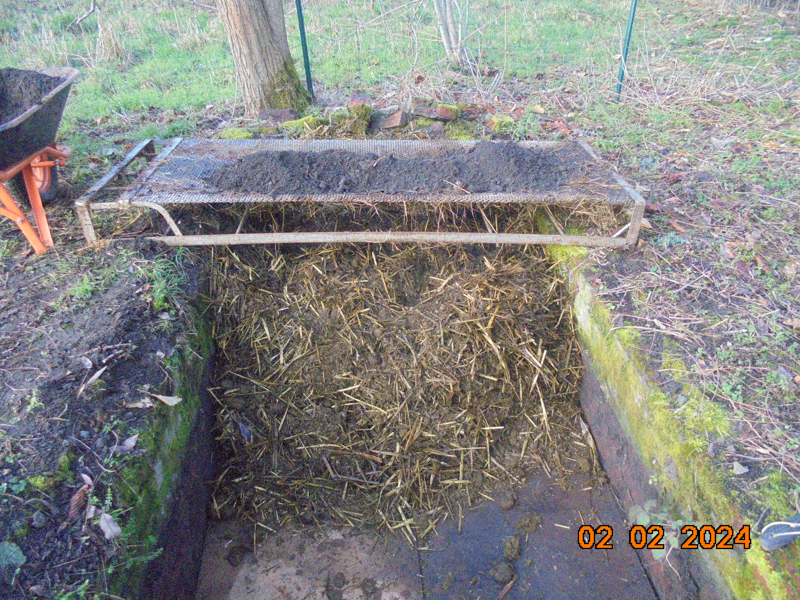 Comme dans la couche, il y a plein de cailloux et de morceaux de fer, j'ai retiré cette terre sur 40 cm de profondeur. Dans le fond, j'y ai déposé des cartons et ensuite, une couche de 30 cm de fumier pour recouvrir de terre que j'ai auparavant, tamisée avec un ancien sommier à fins ressorts.