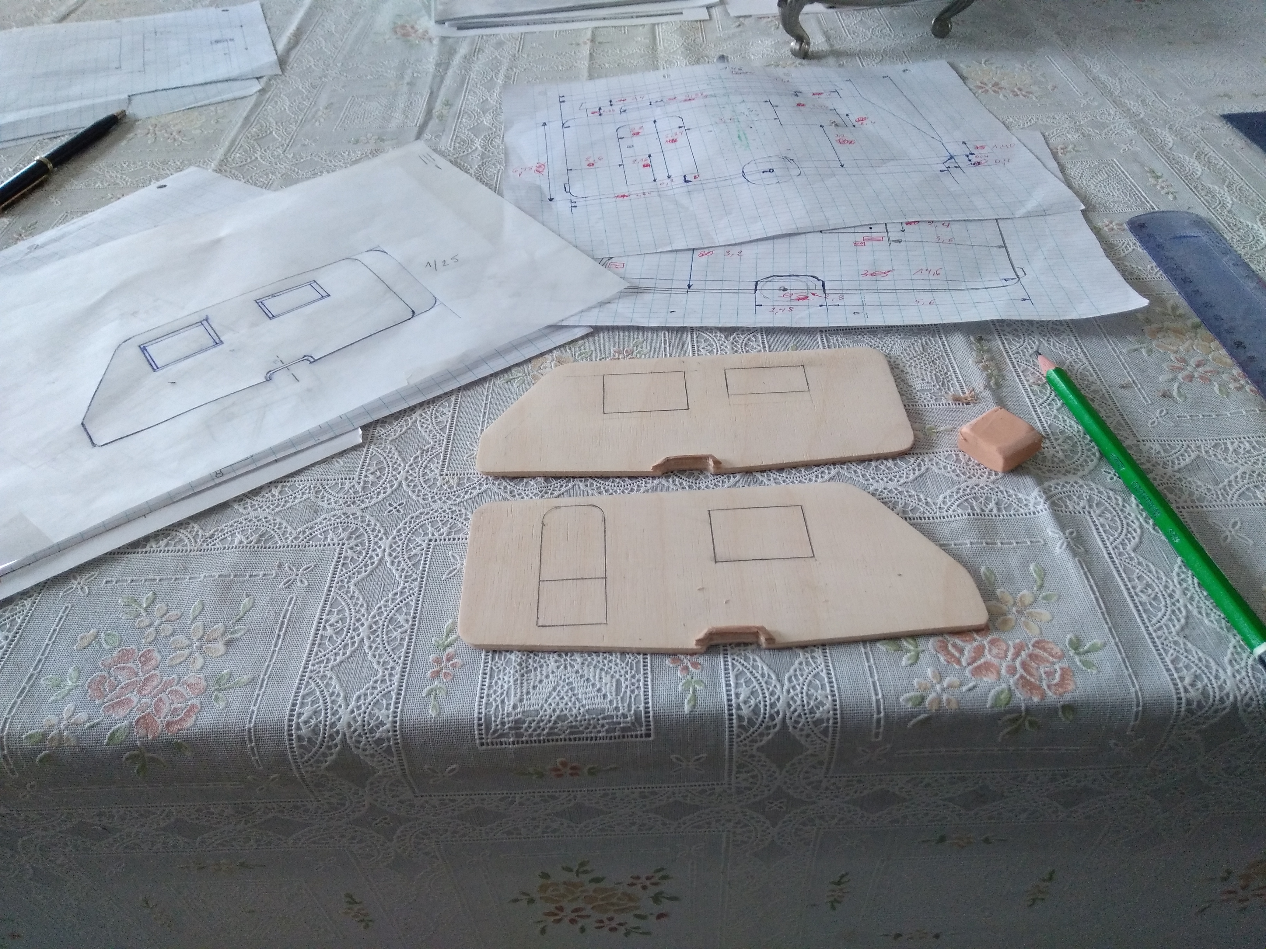 De ce fait, comme j'ai fait beaucoup sur cette caravane, elle me tient à cœur et aujourd'hui, j'ai profité du soleil, pour mesurer cette caravane dans tous les sens. Le pourquoi, j'ai commencé à en faire les plans au 1/25 millième et je vais en faire une maquette. Rien que pour le mesurage, ça m'a pris presque la matinée et j'ai à peine mangé à midi pour en faire le plan au 1/25.