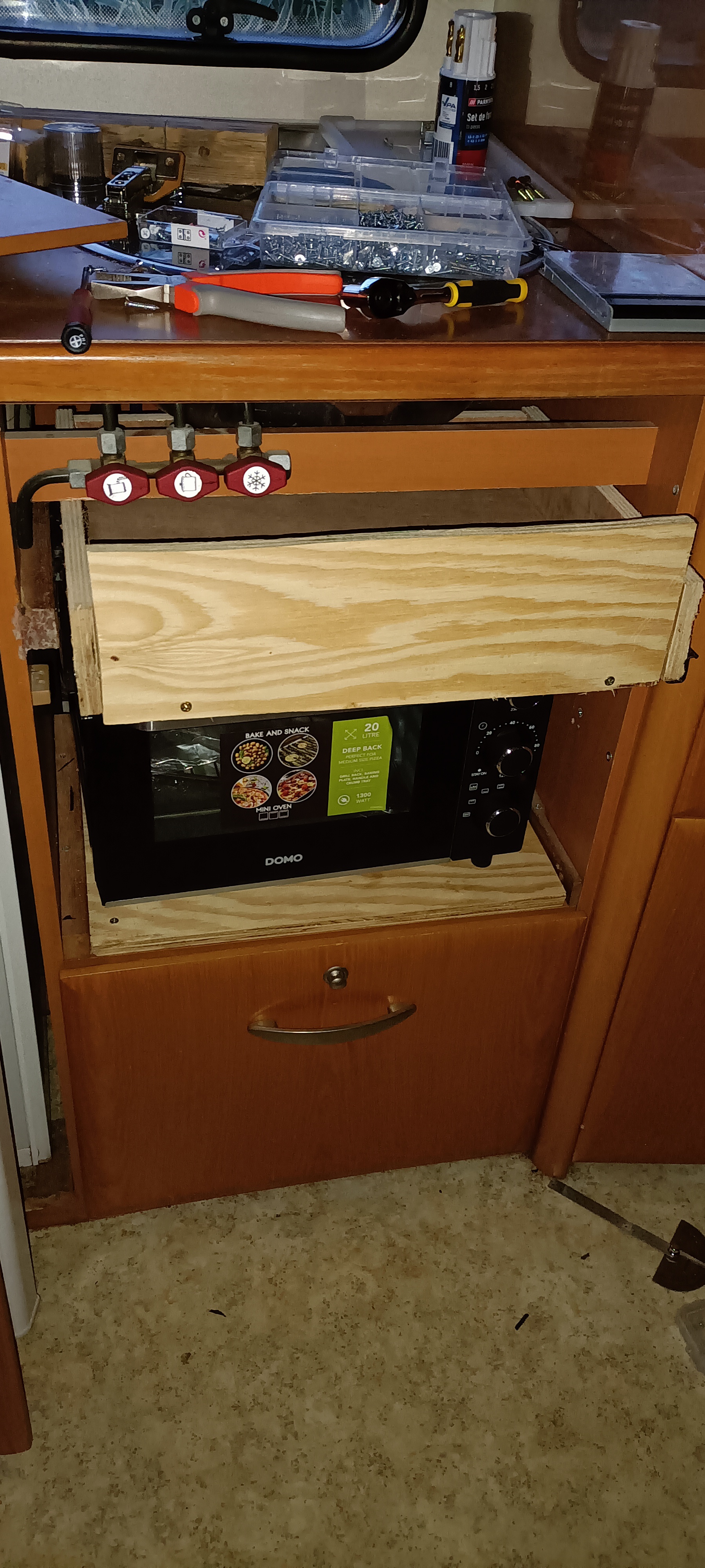 gaine de chauffe arrivé, nouveau micro-onde, nouveau four, nouvelle télé de 32 " (on s'est fait plaisir :D ), nouveau tableau électrique, chaudière instantannée gaz, cuve d'eau propre 60 litres car si je prenais plus en contenance, la hauteur posait problème avec l'arrivée d'eau, et tout ce qu'il faut en bois pour construire mon bureau dans la penderie... il manque encore deux trois bricoles mais le principal est là