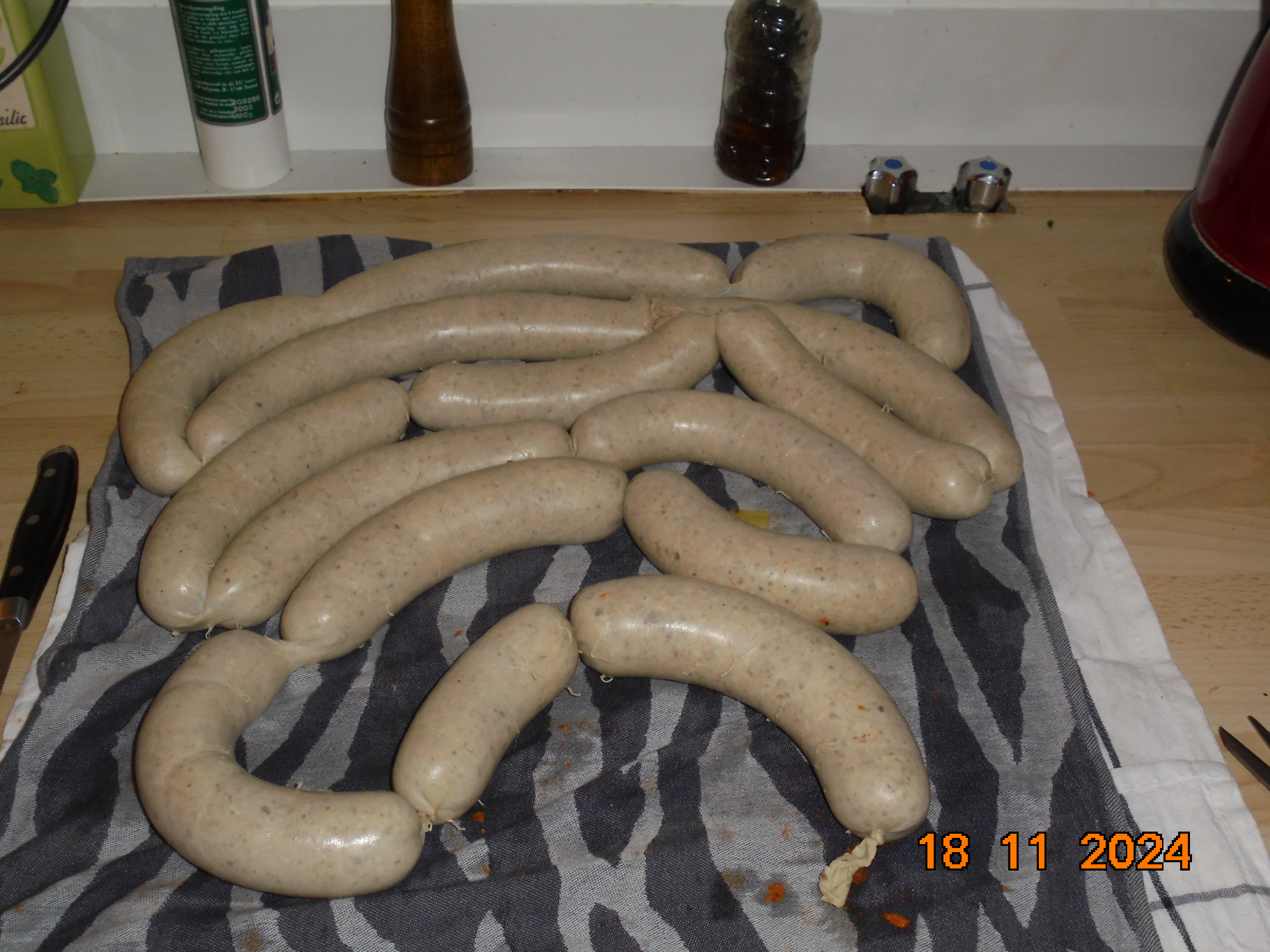 Hier, j'ai fait 6kg 525g de boudin blanc de poulet. La moitier avec des chantrelles et trompète de la mort et l'autre moitier, avec des poivrons et piment d'Espelette.
