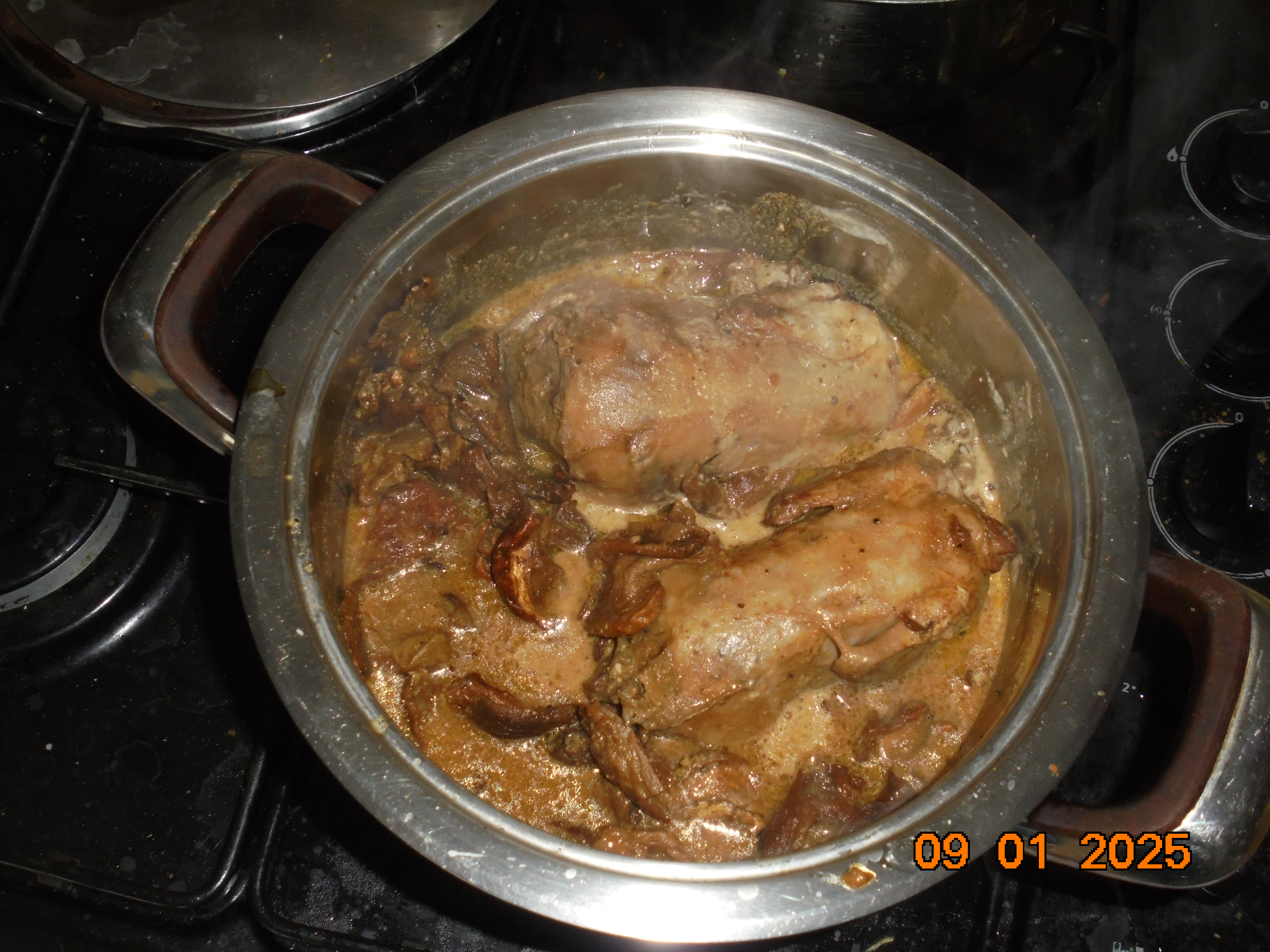 Pour ce midi, comme mon fils est venu me rendre visite, j'avais sorti deux cailles farcies aux "morilles" et aux cèpes le tout cuit avec de la crème de coco. Avant les fêtes, j'avais acheté deux lots de deux cailles farcies. Bien entendu, comme légume, il me restait des trompettes de la mort séchée par moi-même. En en accompagnement, une écrasée de PDT avec du bon beurre au sel de Guérande. En apéro, fine trance de filet mignon de porc fumée par mes soins.