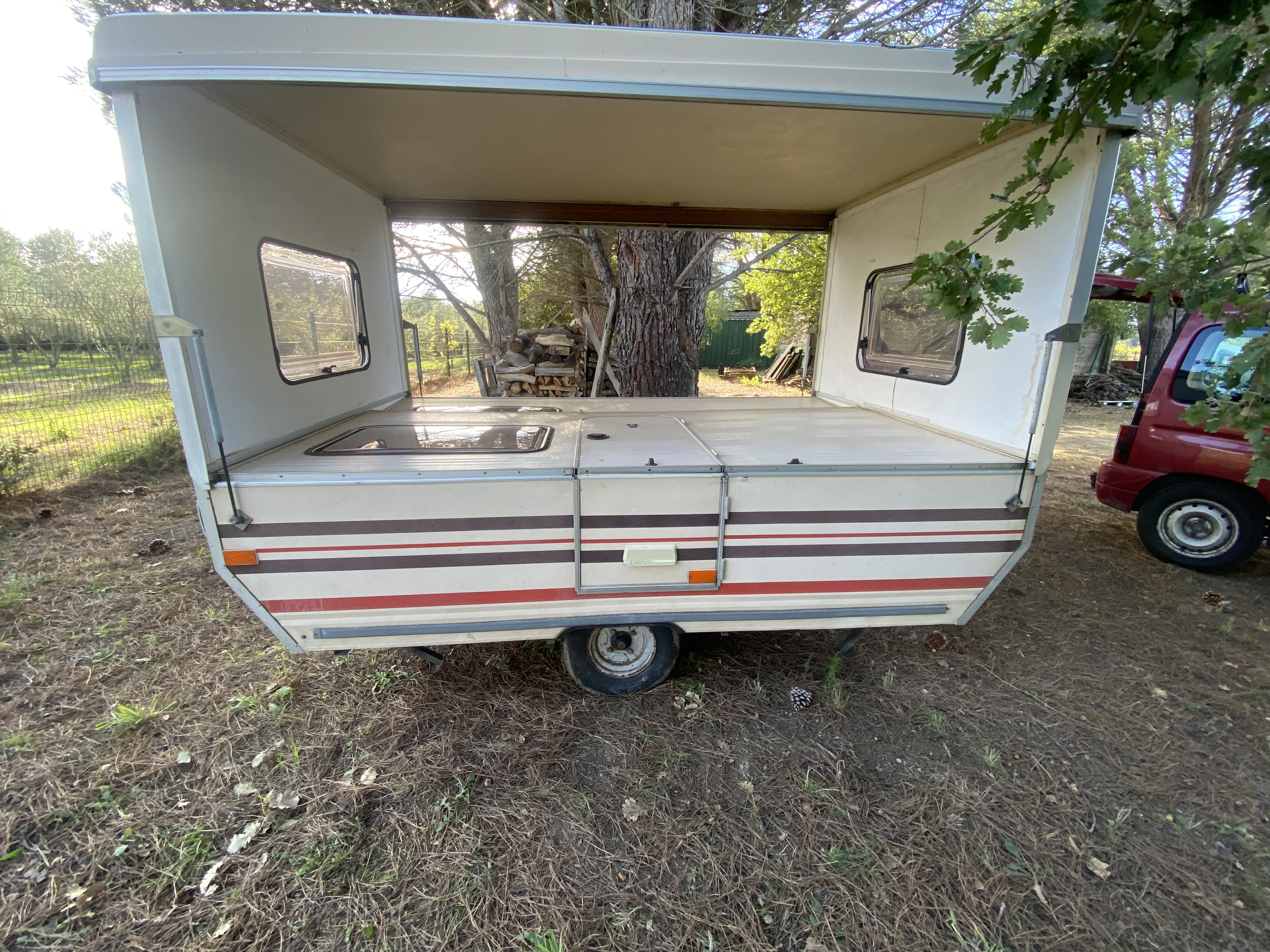 Le panneau que j’ ai démonté a été remisé, et la caravane est repliée et fermée à chaque fois après le bricolage