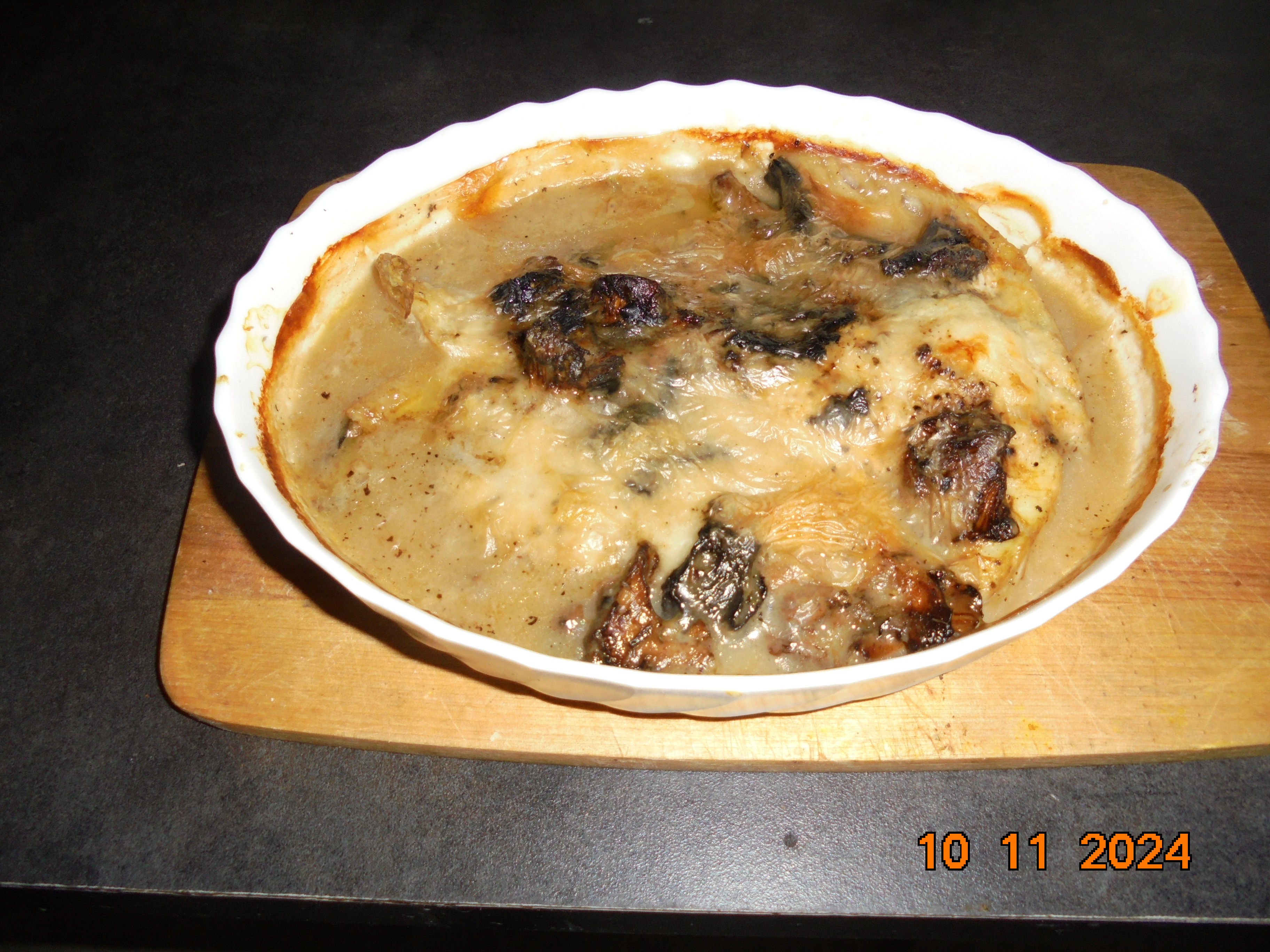 Hier, ce fut des filets de cabillaud avec un mélange de mes giroles et trompettes de la mort cuite au four avec une béchamel et semoule à couscous.