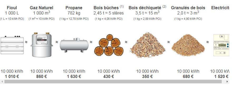 Pour ma part je suis au Gaz propane et je paye 1300 € la tonne , alors que dans le tableau c'est 1600 € pour 750 kg !!!!!!!!