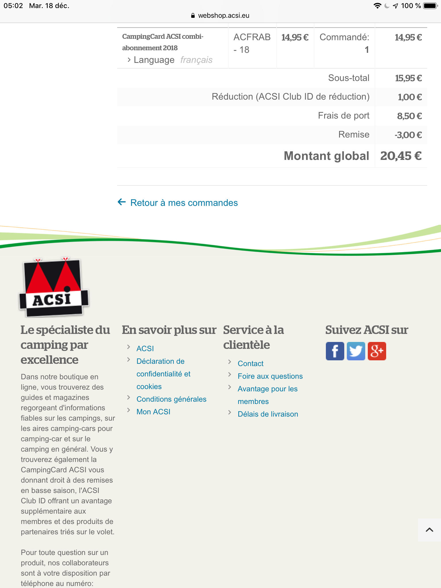 Je suis abonné au CampingCard ACSI combi-abonnement 2018 et je règle :