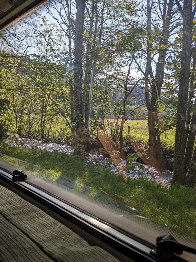 Emplacements délimités par hautes haies (pas mal de vent ) en bord de rivière pour la plupart .